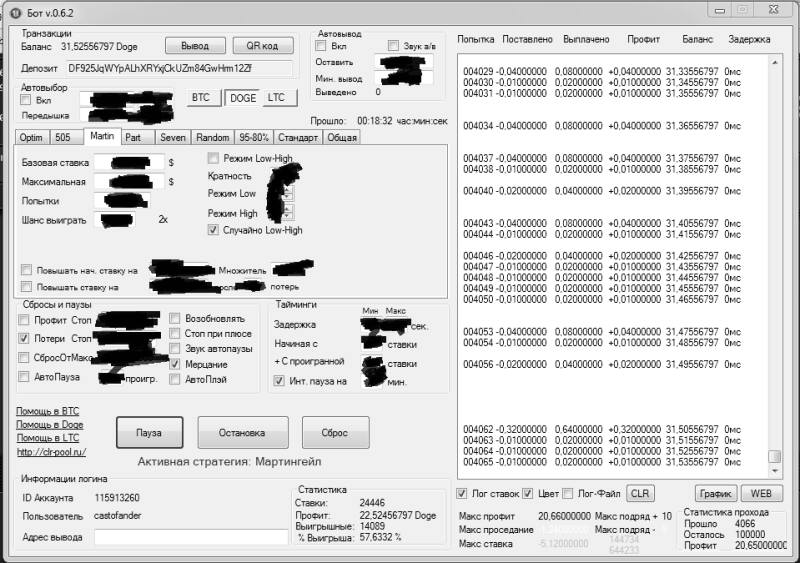 WinBot - бот для игры на dice сайтах, с поддержкой нескольких сайтов и стратегий В данный момент поддерживаются сайты: 999dice.com primedice.com safedice.com В боте имеются сратегии: Мартингейл, Лабушер, Фибоначчи, Д'Аламбер, WinBets. Все они могут быть настроены, как вы считаете нужным. В боте присутствует режим программиста, где можно создать любую стратегию с помощью lua-скрипта. Автоматически рисует график профита для вашей ставки, который может быть экспортирован в .PNG изображения, а также автоматически загрузить на imgur для облегчения обмена. Автоматически сохраняет все ставки, сделанные в боте в локальной БД SQLite для дальнещих запросов, так что вы можете легко найти любую ставку, а также проверить свои ставки на честность, чтобы убедиться, что сайт не обманывает вас. Бот показывает много статистики и информации, ваш текущий баланс, профит, ставки, победы, потери, прогнозирует прибыль в час и за день, и вычисляет, сколько потерь вы можете позволить себе. Бот может эмулировать свою стратегию до 100 000 ставки, (это может занять несколько минут) и рассчитать прибыль. Вы можете экспортировать ставки в CSV-файл (Excel или эквивалент программы сможет открыть его), чтобы рассмотреть ставки тщательнее. Эмуляция ставок использует собственный алгоритм сайтов. Можно проверить числа на сайте, вставив свой номер сервера, номер клиента. Их можно потом экспортировать в CSV-файл для удобного просмотра. В боте есть уведомления по электронной почте и звуковые уведомления, которые можно включить/отключить для определенных событий, также имеет всплывающие уведомления для событий, и всплывающее окно статистика когда Вы нажмете на иконку в трее. Скачать бота можно на сайте автора bot.digitalxsoft.ru