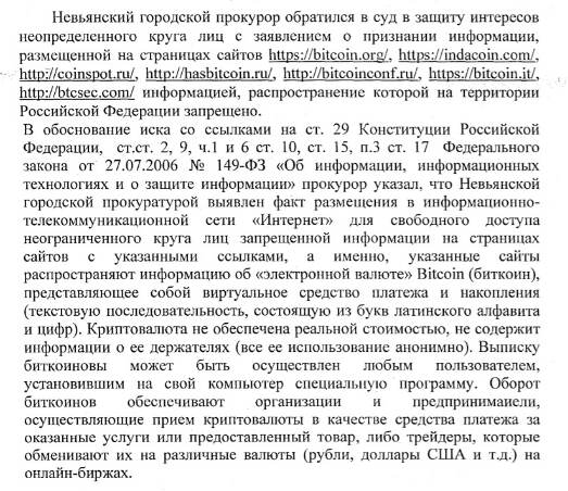 Напоминаю, что биржа btc-e.com до сих пор под блокировкой. Решение суда. Прокуратурой Приморского района Санкт-Петербурга проведена проверка по факту размещения в сети Интернет запрещенных информационных материалов, в ходе которой выявлен факт размещения в информационно-телекоммуникационной сети Интернет для свободного доступа неограниченного круга лиц запрещенной информации на страницах сайтов btc-e.com, bitstamp.net, а именно указанные сайты распространяют информацию об «электронной валюте» Bitcoin (биткоин), представляющей собой виртуальное средство платежа и накопления (текстовую последовательность, состоящую из букв латинского алфавита и цифр). Указанная криптовалюта не обеспечена реальной стоимостью, не содержит информации о ее держателях (все ее использование анонимно). Оборот биткоинов обеспечивают организации и предприниматели, осуществляющие прием криптовалюты в качестве средства платежа за оказанные услуги или предоставленный товар, либо трейдеры обменивающие их на различные валюты (рубли, доллары США, евро и т.д.) на онлайн-биржах. Отсутствие в системах криптовалюты контролирующего центра, влечет невозможность обжалования или отмены несанкционированной транзакции, а фактическое нахождение криптовалюты вне правового поля не предоставляет возможность реализации правовых механизмов обеспечения исполнения обязательств сторонами сделки. Так, если оплата произведена, но услуга или товар не получены, то нет гарантий возврата такого платежа. При этом биткоины в силу децентрализации не имеют субъекта, обеспечивающего их условную платежеспособность. По результатам проверки прокуратурой района подано заявление в Приморский районный суд в порядке ст. 45 ГПК РФ, о признании информации размещенной в сети Интернет на страницах сайтов btc-e.com, bitstamp.net информацией, распространение которой на территории Российской Федерации запрещено. Решением Приморского районного суда от 11.11.2015, указанное заявление удовлетворено, информация размещенная в сети Интернет на страницах сайтов btc-e.com, bitstamp.net призанана информацией, распространение которой на территории Российской Федерации запрещено.