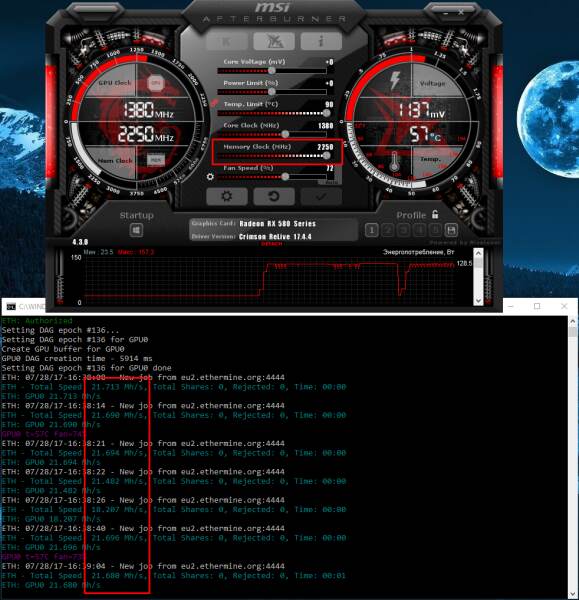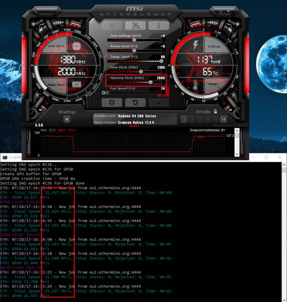 Здравствуйте. Карта RX 580 8GB Gaming X в стоке на эфире выдает 21.6 Mh/s, но если в Afterburner поменять значения Memory Clock ничего не меняется. Хотя пару раз при изменении этого параметра скорость поднималась до 24.5 Mh/s, но после перезагрузки компа, скорость сбрасывалось и повторный разгон ни к чему не приводит. В стоке: В разгоне: Драйвера менял. MSI Afterburner устанавливал на разные версии. Другие версии Claymore ставил. Ничего из этого не помогает, может кто в курсе в чем может быть проблема?