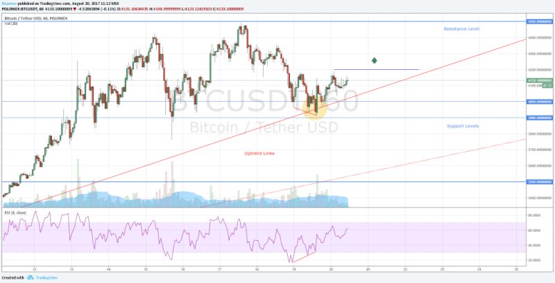 Цена отскочила от зоны поддержки, сформированной линией восходящего тренда, и уровня поддержки 4000.00-3900.00. RSI и бычье расхождение подтвердили разворот цен. Пришло время покупать. Локальный высокий уровень будет хорошим уровнем для размещения отложенных ордеров. Если рынок достигнет уровня 4200,00, он станет дополнительным подтверждением дальнейшего восходящего движения. Стоп-ордера должны быть размещены ниже уровня поддержки 3900.00. Целевой показатель прибыли должен быть на уровне сопротивления 4500.00. Если вы не используете плечо, рекомендуемый объем торговли для этой сделки составляет до 5% от вашего депозита. Покупка: 4200.00 Стоп лосс: 3890,00 Целевые показатели прибыли: 4460,00 Расчет сделан на основе графика Poloniex.