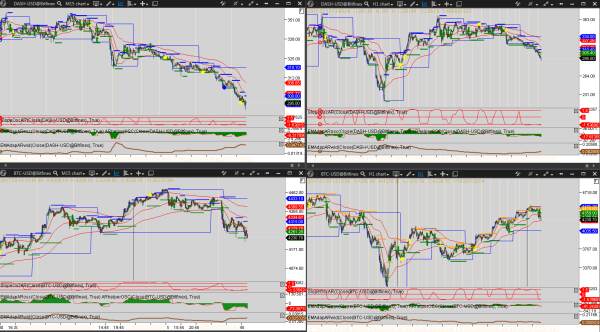 Работа с графиками в торговой платформе ATAS crypto доставляет истинное удовольствие. Можно открыть любую криптопару в отдельном окне чарта, таких окон можно наоткрывать столько, сколько выдержи компьютер. В каждом окне можно задать свой таймфрем и наложить индикаторы. Сохранить это пространство один раз и открывать его каждый раз когда нужно. Таких пространств можно опять же насоздавать множество и переключаться между ними очень быстро и легко. Среди индикаторов также можно прописать свои собственные и использовать их так как они понимаются для принятия торговых решений. Для примера вот как выглядит рабочий стол из четырех графиков разных таймфремов. Здесь графики BTCUSDи DSHUSDв 1 часовом и 15 минутном формате, с наложенными на них одинаковыми шаблонами пользовательских индикаторов. Очень удобно и просто. Продолжение последует…