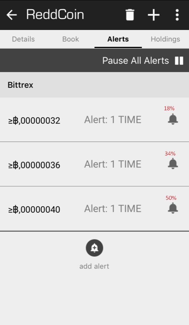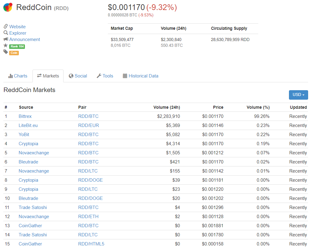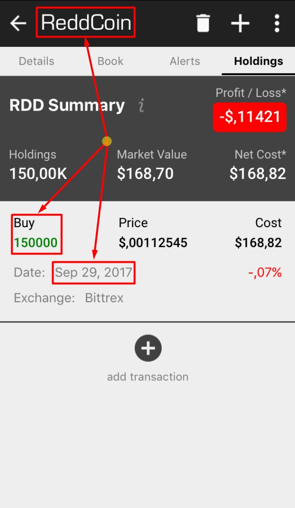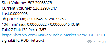 Итак, тестирую первый сигнал. Монета: RDD По цене сигнала войти не успел (об этом ниже). Кстати, рекомендовали всё же входить по сигналу: несколько пунктов при такой цене дают нелишний процент. По сути обычный крипто-коин, достаточный объём есть, все торги на Биттрексе: Так успел войти: Цели на продажу (в BTC, а не в USD) поставил следующие: 18%, 34%, 50%, в равных долях: Итого: Опробуем сигнал без дополнительной аналитики. Вообще без какой-либо аналитики. Результат буду смотреть на горизонте 5-7 дней.