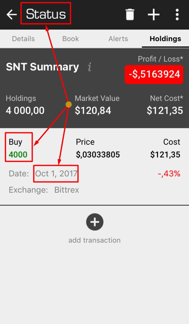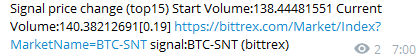 Всем привет! Получил новый сигнал: https://bittrex.com/Market/Index?MarketName=BTC-SNT Мой вход: Цели на продажу (в BTC, а не в USD) поставил следующие: 18%, 34%, 50%, в равных долях (цели пока не пересматривал, оставил свою схему, как при прошлом сигнале): Смотрю итоги на горизонте 7-10 дней.