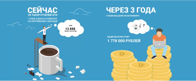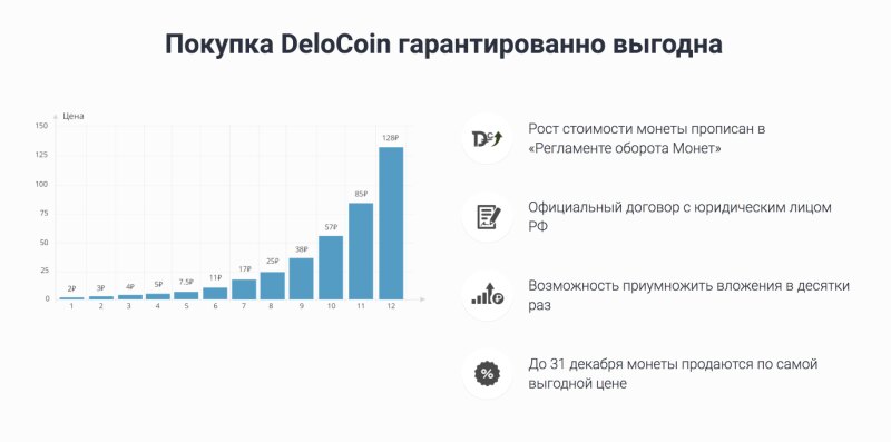 DeloCoin – монета которая растет в стоимости +50% каждые 3 месяца Юридически зафиксированный рост стоимости Возможность продать монеты в 128 дороже стоимости покупки DeloCoin – виртуальная валюта сервиса ДелоРуб, которой можно оплатить услуги, а также строительство дома, уборку квартиры, создание сайта и тысячи других задач. Ознакомиться с документами и деталями проекта можно на официальном сайте delocoin.com