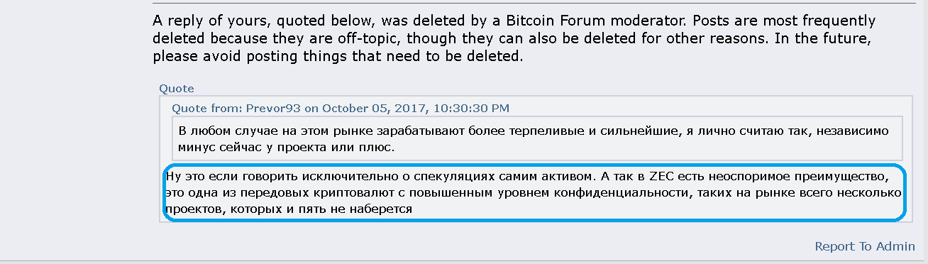 Помню как то раннее уже писал на просторах данного форума о том что у модераторов форума bitcointalk.org периодически вспыхивают необоснованные приступы неадекватности, граничащие с маразмом Но все как то было не до сук запруфить один из таких всплесков, а тут подвернулся случай Топик криптовалюты ZeroCash [rus] https://bitcointalk.org/index.php?topic=1627629.0 А вот чего сегодня получил Маркером выделено то сообщение которое было удалено модером) Меня это улыбнуло