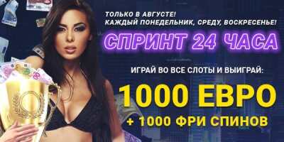 СПРИНТ НАЧИНАЛСЯ! Спринт-турнир уже стартовал, и у тебя есть всего 24 часа, чтобы участвовать в розыгрыше 1000 EUR + 1000 Фри спинов. Делай ставки на реальные деньги в любых слотах и зарабатывай баллы. 1 EUR ставок равен 1 баллу. Чем больше баллов ты заработаешь, тем больше твои шансы на выигрыш! Зачисление призов состоится на следующий день в 18:00 (UTC+0). Не упусти возможность получить свой приз!