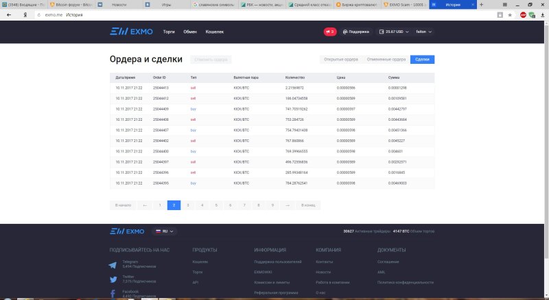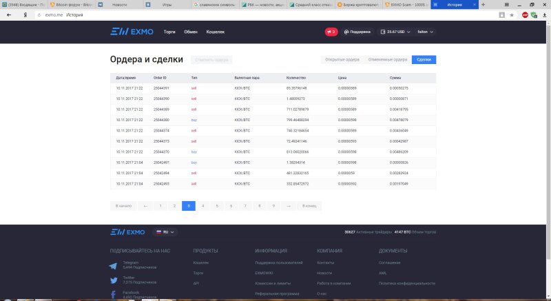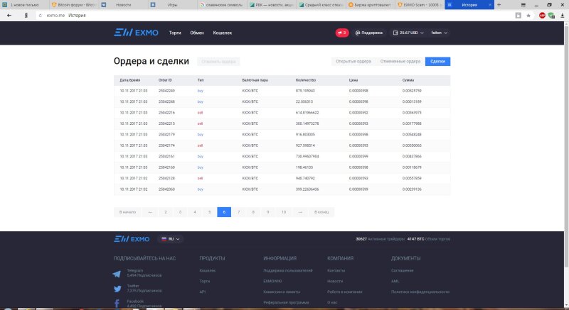 Здравствуйте, хочу поделится своей историей взлома аккаунта на бирже эксмо, как видно на скринах, после взлома аккаунта стали проводится сделки купли продажи монеты с разницей примерно в 30 сек, причем монета покупалась дороже продавалась дешевле, сделки шли подряд, сначала я подумал на злоумышленников, но во-первых вывода средств не было, и кому вообще выгодны подобные манипуляции. Поразмыслив пришел к выводу единственный кто полчает выгоду с подобных операций это биржа(комиссия с каждой сделки), соответственно это либо умышленные действия биржи либо глюк, но они эти действия не комментирует, говорят что они ответственности не несут. Вывод делайте сами, таких страниц со сделками у меня много, просто все выставлять смысла не вижу характер один и тот же просто с разными монетами, если кому понадобиться могу сделать больше скринов.
