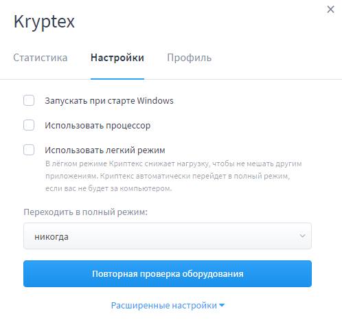 Вижу что про Kryptex, есть несколько тем, но ни одна толком не показывает суть... Поэтому хочу Вам показать, что это такое и с чем его едят... Программа доступна для майнинга и на GPU и на CPU , для самых ленивых, прописывать какие-либо БАТники - не нужно!!! И теперь перейдем к остальным плюсам: Выводить можно как биткоинами так и через Qiwi , причем через второй вариант полностью БЕЗ КОМИСИИ, а уже с qiwi Вы можете перекинуть на любую другую валюту через простые обменники ( об этом позже еще детальней расскажу). Вывод идет от 0,0006 BTC, а если выводить тем же Киви, то минималка от 50 рублей. Грубо говоря выводить можно каждый день . ( единственное что при выводе в биткоинах, не зависиммо от суммы комисия будет тех же 0,0005 BTC, поэтому если копить биткоины, лучше выводить суммы побольше.) Что немаловажно, в программе есть реферальная программа, дающая Вам 10% от того что намайнили Ваши реферералы НЕ В УЩЕРБ Вашим рефам В данном майнинге присутствует и неплохой интерфейс с минимальными настройками, которые помогут облегчить Вам настройки : Данный функционал помогает слабому железу справится с майнингом, не сильно нагружая Вас и сам ПК. Ну и конечно страница самого профиля, дающая выбор Языка, выбор отображения валюты в самом интерфейсе программы и конечно данные самого профиля. Есть неплохой, но довольно информационный сайт самой программы Kryptex.org где можно не только ознакомиться со своим балансом, но также посмотреть и график своего майнинга, тех же рефералов, попросить при необходимости помощи у тех поддержки Надеюсь что максимально обширно раскрыл данную тему, если будут вопросы пишите в коментариях либо на фейсбук https://www.facebook.com/kryptex.mining.9 , если кто то решить присоединится к Нам - милости просим (тыкаем на ссылочку ) Kryptex.org .