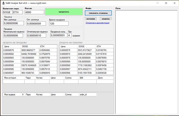 YoBit Scalper Bot v0.9 — автоматическая торговля на бирже YoBit по стратегии «скальпинг». Описание Бот предназначен для автоматической торговли на бирже YoBit по стратегии "Скальпинг". Торговать можно на любых парах. Программа не закончена, но задачу выполняет. Лежит просто так, решил народу отдать. Полная документация скоро будет (наверно). Настройка: В файле api.txt первая строка - key, вторая строка - secret. Берем на YoBit. Интерфейс: Валютная пара — валютная пара для торговли. Кол-во — сколько монет первой криптовалюты купить за вторую. Мин. разница — минимальная разница между стаканами, при которой бот войдет в торговлю. В этом случае бот выставит свой ордер по цене первого ордера в стакане. Опт. разница — оптимальная разница между крайними ордерами в стаканах, при которой бот войдёт в торговлю. В этом случае бот выставит свой ордер по цене на 0,00000001 выгоднее крайнего ордера в стакане. Время ожидания — количество секунд, которые бот ожидает после того, как обнаружил, что разница между крайними ордерами в стаканах позволяет скальпить. Минимальная наценка — минимальная наценка, которую бот будет выставлять если выше нашего ордера есть не больше X ордеров. Оптимальная наценка — наценка, на случай если мы можем встать первыми. Продажа в ноль — продавать в ноль при большом количестве ордеров выше нашего. При X ордерах — если X ордеров для выше нашего ордера - пытаемся продать в ноль. Показать стаканы — отобразить стаканы в программе. История — моя история по текущей валютной паре. Ордера — мои ордера по текущей валютной паре. Также бот умеет: Отмена ордеров на покупку — если бот выставил ордер на покупку и потом обнаружил, что кто-то нас перебил – он отменяет его и заново ждет благоприятного момента. Незначительные мелкие ордера (до 30% от нашего) игнорирует. Отмена ордеров на продажу — если бот выставил ордера на продажу и потом обнаружил, что кто-то нас перебил – он отменяет его и делает цену на 0,00000001 выгоднее последнего, если не нарушаются условия «Минимальная наценка» и «Продажа в ноль». Незначительные мелкие ордера (до 30% от нашего) игнорирует. Текущая стратегия: Для текущей стратегии нужно, чтоб на балансе был ETH, за который будут покупаться DOGE. Данная стратегия во время тестов дала X2 за неделю. Страница софта: https://soft.cryptt.men/exe/2 Чат поддержки, вопросы, идеи, пожелания: @bablobtn