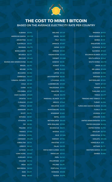 Аналитическое издание Elite Fixtures составило список затрат на майнинг с использованием средних тарифов на электроэнергию в 115 странах по состоянию на январь 2018 года. Подчеркнем, что включены только лишь энергетические затраты на майнинг без учета стоимости оборудования для майнинга. Ниже приводится весь список: В США средняя стоимость майнинга одного биткоина составляет $4758 ( имеет место сильный разброс стоимости по штатам: например, в Луизиане средняя стоимость добычи одной монеты составит $3224). В России за один биткоин в среднем нужно заплатить $4675, в Беларуси — $2177. Страны с дорогим BTC: Южная Корея — $26 170; Бахрейн — $16 773; Соломоновы Острова — $16 200 Страны с низкой ценой BTC: Венесуэла — $531; Узбекистан — $1788; Украина — $1852; Ниже показана карта распределения стоимости майнига по странам мира