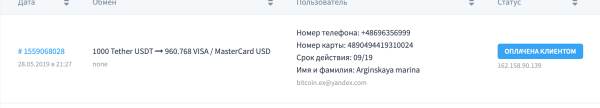 Прошел год, а это животное все также пользуются той же самой картой Сегодня нам пришла заявка в обменник, все аналогично Вашему сообщению выше. Разумеется никаких транзакций нет. Но знаете что самое интересное, у этого персонажа та же маска подсети, что и создания на которого нами было написано заявление в органы по факту махинациям с USDT Судя по тому, что картой этой уже пользуются год, передадим следователям информацию. Лишней точно не будет.