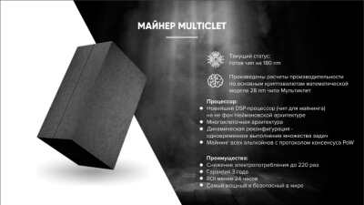 Компания RMC разрабатывает майнер нового поколения - Multiclet, и нам не обойтись без талантливых энтузиастов криптовалютного мира! Multiclet - это майнер, в основе которого заложен новейший DSP-процессор на не фон Неймановской архитектуре. Основные преимущества этого устройства заключаются в возможности майнинга любого альткоина с протоколом консенсуса POW, официальной гарантии от производителя и самом эффективном потреблении электроэнергии! Для ускорения процесса написания ПО для этого майнера, мы запустили конкурс для разработчиков. Основная задача конкурса - создание софта для Multiclet под определенный альткоин, который участники определяют для себя самостоятельно. Участвовать могут как команды разработчиков, так и индивидуальные разработчики. Победителей ждет возможность заложить 1% майнинга в код. А лучшие и своевременные работы будут поставляться с майнером. Как мы будем оценивать работы? все очень просто, работы будут проверяться на их быстродействие и энергопотребление. Для каждого альткоина будет выбран наиболее эффективный софт. Конкурс будет проходить в несколько этапов: Февраль - апрель: разработка ПО Апрель - май: проверка и оценка работ Июнь: озвучивание результатов Если вы заинтересованы, то осталось только подать заявку на странице https://rmc.one/ru/multiclet/ Желаем удачи!