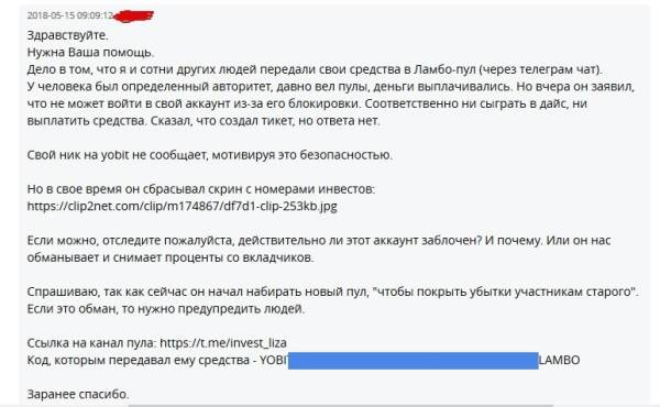 Я думаю Yobit в целом и лиза с ламбо в частности не требуют представления, так же практически все осведомлены о размере порога входа в инвест. По этой причине, расплодились в последнее время пулы предлагающие со инвест. Вот поучительная история одного из них (расследование провел @johnseee один из вкладчиков, выложив на созданном канале https://t.me/yobit_scam ) . И так поехали.