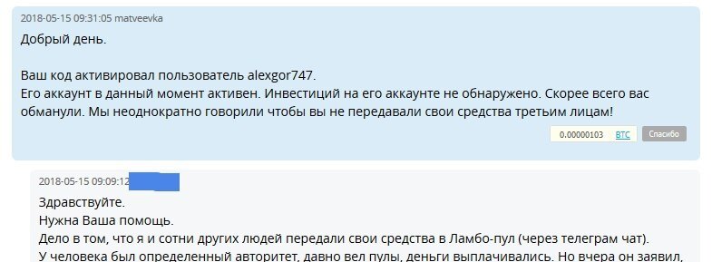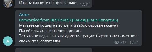 Продолжение... С момента начала расследования прошли почти сутки. У Посейдона была хорошая возможность выйти из ситуации как минимум неплохо - скинуть скрин, сообщить, что пул на другом акке и предоставить любые другие доказательства, которые подтверждают блокировку этого акка, показать тикеты от биржи, где он ждет ответа. Но зачем отчитываться перед лошарами? Главная новость - участники биржи забросали биржу запросами по поводу пула посейдона и его засвеченный аккаунт заблокировали. Непонятно, были ли там деньги вне инвеста и как биржа будет выяснять обстоятельства. Кстати, все смогли убедиться, что при должной настойчивости Матвеевка отвечает довольно быстро. Можно решить проблему или хотя бы выяснить причину блокировки (если она всё-таки есть на другом акке), ее сроки. Но видимо администрация биржи недостойна многократного обращения Посейдона. Если они не хотят отвечать на его запрос - то это их проблемы. ) Ведь не важно, что курс Ламбо с момента заявленной блокировки упал с 3000 до 630, почти в 5 раз. Другие новости: 1. Посейдон навел порядок в чате, забанил всех кто создает плохую ауру, негативные флюиды и мешает создавать новый пул 2. Сьездил по своим делам, отдохнул, принял ванну. Наконец-то после недели бессонных ночных дайсов.... 3. Собирает новый пул по Ламбо. Идет со скрипом, но вкладчики находятся. Видимо не все знают о ситуации и продолжают доверять ему 4. Меня обозвали конкурентом, хотя я четко привел свою переписку с модератором биржи с указанием переданного кода. Это кстати, излюбленный аргумент всех мошенников - обвинять во всём конкурентов. 5. Король морей не соизволил снизойти до "дольщиков" и ответить хоть на один вопрос по сути, с доказательствами. В чатах вкладчиков стоит паника и ни одного внятного ответа. Из веселого - о ссоре Посейдона и Криптомастера По их словам, они поссорились и разошлись. Но при этом в чате Свидетелей Лизы, которым управляет Криптомастер, о Посейдоне правду писать нельзя. Банят за это. За разбан просят 100 рублей. ) Выглядит эта "ссора", будто попытка отделить первого от второго, чтобы Криптомастер мог смело собирать людей в новые пулы. Хотя мне кажется, что это люди с невероятно похожим стилем общения. Скорее всего знают друг друга в реальной жизни, возможно родственники. Я совсем не удивлюсь, если это один человек. Но это только мои предположения. Вижу, что многие в его чатах еще надеятся на то, что Посейдон вернет их деньги. Ведь, если бы кинул с концами, то уже давно б пропал. А так не пропал, значит надеется сохранить возможность заработать еще с помощью каналов. Я кстати, тоже думаю, что вернет. Но вернет он их тогда, когда вы на них сможете проехать две остановки в городском транспорте. И вернет с огромной помпой! Скажет, вот видите - все говорили кидала, а я вернул!!! )) Конкуренты наклепы делали, бля ) Напругу сеяли! Это очень хитрый подход, но психологически может сработать. Он либо очень хитрый и терпеливый мошенник, либо неадекватный неадекват. В любом случае ему не стоит доверять ни копейки. Но я готов извиниться перед ним при одном условии - если он вернет деньги людям в битках/рублях по курсу либо на момент вклада, либо на момент блокировки. А пока к Посейдону есть серьезные вопросы. Приблизительно такие, как он задавал человеку, заблоченному им ранее без единого доказательства.