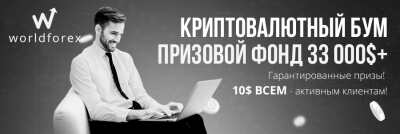 Конкурс трейдеров "Криптовалютный бум". Спешите зарегистрироваться, старт конкурса назначен на 01.06.2018. Регистрация продлится до 17.06.2018 года. Участие бесплатно! Конкурс представлен двумя группами соревнующихся счетов: “Форекс” и “Бинарные опционы” с общим динамическим призовым фондом[1] - 33 200 > ∞ USD, 10 000 USD из которых разделят между собой первые 25 участников таблицы ТОП выбравших Форекс активы, и следующие 25 участников предпочитающих торговлю Бинарными опционами. Соревнуйтесь среди равных за главный приз! Все остальные участники, не вошедшие в топ призеров, получают утешительный приз 10 USD за активное участие в конкурсе! В дополнении к конкурсному бонусу, новые[2] клиенты получают +500 баллов в программе Rebate Clab (эквивалент 5 USD). Для вывода прибыли с призового бонуса не требуется отработка [3] Поспешите зарегистрироваться в конкурсе трейдеров «Криптовалютный бум» . Это отличный способ заработать стартовый капитал без собственных вложений! Что Вам даст участие в конкурсе трейдеров: - Участие в конкурсе абсолютно БЕСПЛАТНО! - Призовой фонд от 10 000 $ до ∞ - Неограниченное количество призовых мест - Призеры ТОПа – 50 участников (25 - форекс и 25 - бинарные опционы) - Каждому активному участнику бонус 10 USD - +500 баллов Rebate Club новым клиентам. - Кредитное плечо 1:100 - Торговые инструменты: Форекс, Бинарные опционы, опционы 0-100, криптовалюты (плечо 1:10) Пройти регистрацию и подробнее узнать условия конкурса можно на официальной странице конкурса: «Криптовалютный бум» >> [1] Динамический призовой фонд - сумма динамически меняется в зависимости от общего количества участников, с последующим распределением между участниками групп Форекс или Бинарные опционы. [2] Новый клиент- зарегистрированный в период регистрации в конкурсе. [3] Для торговли на Forex прибыль доступна к выводу без дополнительных условий отработки. Для Бинарных опционов необходим минимальный торговый объем для вывода прибыли. Подробнее в правилах >>. Дополнительная возможность! Заработайте общением! Поделитесь новостью о конкурсе в социальных сетях и получите денежное вознаграждение! 10 призовых мест - по 50$ каждый! Розыгрыш в режиме онлайн! Дата розыгрыша и объявления победителей: 22.06.2018 Новости для репоста: VK - https://vk.com/public39755942?w=wall-39755942_29903 FB - https://www.facebook.com/worldforex/posts/1316125438489275 С наилучшими пожеланиями, World Forex
