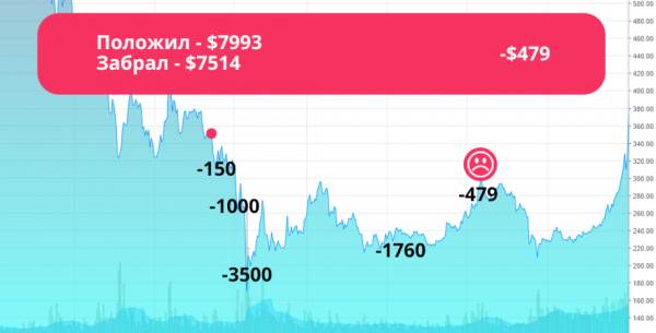 Сегодня не будет никакой success story, но расказ менее интересным от этого не станет. Расскажу я о том, как в прошлом году году покупал-продавал биткоины, и что из этого получилось Предыстория Для того, чтобы понять, что мной руководило в момент первой покупки — о биткоинах слышал давно, еще когда они по 20 долларов были. В 2013 году даже хотел купить по курсу $120, но вскоре передумал. Через месяц после желания они стоили уже $1000 за штуку. Я кусал локти Вскоре пузырь лопнул, биткоин упал, все успокоились. Второй разначал я вернулся к криптовалюте в октябре 2014. Случайно увидел график курса, выглядел он так: Почему-то мне показалось, что падение вот-вот остановится, начнется стабилизация и потом опять резкий рост. И 21 октября я купил первый биткоин. (Нужно сразу сказать, что это все же не биткоины в чистом виде были, а их аналоги в webmoney — wmx. То есть, фактически обмен валют внутри самого кипера. Я не планировал серъезную торговлю, хотелось просто попробовать удачу и, поскольку на вебмани у меня лежали доллары, потратил их на парочку биткоинов. Все обмены производились через этот сайт) Подход №1 21 октября 2014 года я купил 2,6 биткоина по курсу 384 доллара за штуку, заплатив при этом 1000 долларов. Это была та сумма, которую я не боялся потерять. Почти сразу же курс упал на 20%, и я оказался в минусе на 200 долларов Еще через неделю курс начал расти и на самом пике сумел продать все биткоины. Чистая прибыль за 1 месяц составила 140 долларов. Тогда же друзья в соц. сетях тоже писали, что последовали моему совету и немного наварились (тыц 1). Итог: $1000 — положил, $1140 — забрал. +$140 Подход №2 Здесь как в казино. Если в первый раз выиграл, то потом остановиться тяжело. Подождав, пока курс немного просядет, закупился опять. На этот раз повысил вложения, закупился на $2200 по курсу 343. И, как в предыдущий раз, почти сразу же произошло падение. На 7% упала цена, для меня это значило, что пока -150 долларов. На этот случай у меня уже была стратегия: если падает стоимость, то покупаю еще столько же биткоинов уже по новой цене, таким образом уменьшая средний курс окупаемости. Поэтому приобрел еще на 2000 долларов биткоинов по курсу 319. Теперь курс, при котором я выходил бы в 0 — 331 доллар Спустя еще 2 недели курс опять обваливается. По всем рассчетам я на 1000 долларов уже в минусе. Не покидают мысли, что зря все это затеял. Но ум подсказывает, что нужно опять закупаться. Очень сложно было себя пересилить, но все таки закинул еще 3700 долларов. Итого на этот момент в биткоинах уже лежит $8000. Планка окупаемости падает до 305 долларов за биткоин. Этого курса я и собираюсь ждать Но, как это часто бывает, я недооценил размеров падения. Новая неделя и опять обвал цены. Теперь уже до 170 долларов. Я понимаю, что за каких-то 2 месяца спустил на воздух 3500 долларов. Все это происходит на январские праздники. Опять закупать новые биткоины уже нервы не позволили. Но и решил, что продавать не буду. Если прогорит — значит такая судьба. Раньше надеялся на то, что поймаю рост пузыря, теперь надежда, что окуплюсь только спустя долгие месяцы. Деньги заморожены в биткоинах и вывести их по приемлемой для меня цене получится только через 1-2-3 года. Будем ждать И так прошло полгода. Особо ничего не делал. Но нервы не отпускали, каждый день проверял курс. Он то подымался до 290 (мне для окупаемости нужно было 305), то падал до 220. Конечно, это сказывалось 