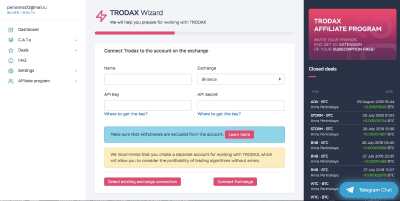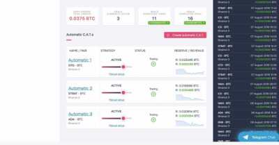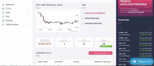 Сегодня опишем, как работает наш Сервис! После регистрации вы попадаете на наш Визард, который поможет Вам запустить нашу систему. Визард задаст вам несколько вопросов: Вы уже приобрели криптовалюту? ДА НЕТ У Вас уже есть аккаунт на торговой бирже? ДА НЕТ Вы знаете как создать ключи API? ДА НЕТ Если Вы что-то не понимаете, выбирайте НЕТ и сможете просмотреть обучающий ролик. Далее вы попадает в раздел подключения к Бирже. Здесь все очень просто - добавляете API ключи от вашего аккаунта на бирже! Мы рекомендуем Вам создать отдельный аккаунт на бирже для работы с Trodax.cat, что позволит Вам определить эффективность торгового алгоритма без ошибок. Далее вы выбираете Ручной или Автоматический C.A.T. вы хотите запустить Если Вы выбираете ручной, то попадаете на выбор валютной пары (есть рекомендации). Если Вы выбрали автоматический вариант, то сразу переходите к резерву! На работу каждого C.A.T. выделяется свой резерв! Для лучшей торговли резервируйте на один C.A.T. не более 20-25% депозита. Минимальный резерв в пересчете на BTC должен быть не менее 0,03 btc , а лучше больше! После выбора резерва , Вам необходимо выбрать одну из 4 подготовленных нами стратегий! Когда рынок медвежий - Мы рекомендуем выбирать стратегию CAREFUL по мере оптимизма на рынке, можно выбирать более рисковые стратегии. И конечно Вы всегда можете выбрать свои настройки - в разделе "настроить вручную" Поздравляю, вы все настроили! Вы можете сразу запустить еще одного или нескольких C.A.T