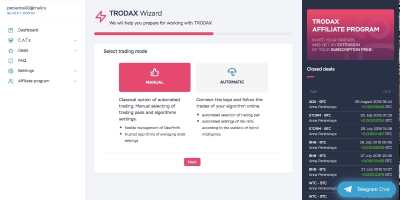 Как сохранить время, заработать денег и не рисковать в процессе? Мы знаем, как. Чтобы зарабатывать деньги и не тратить свое свободное время на изучение рынка, стратегия и оценку рисков, Вам следует понять одну простую вещь: трейдеры чаще всего теряют деньги из-за своих эмоций, заставляющих людей принимать плохие решения. Если Вам не хочется терять деньги, Вам нужно верная стратегия и ее реализация без эмоций. Торговать как робот. Или, скажем, бот. Trodax.com– это лидер рынка в выборе стратегий и самые умные боты, основанные на гибридном интеллекте. Вам не нужны никакие специальные технические навыки чтобы получать прибыль с нашим сервисом. Это так же просто, как использовать Вконтакте. Просто установите коэффициент риска/заработка и предоставьте нам сделать все остальное. Вынебудететерятьвремя. Вынебудететерятьденегиз-заэмоциональныхрешений. Вы будете зарабатывать быстрее и намного безопаснее, чем остальные трейдеры. Помимо этого, мы строим наш бизнес так, чтобы он был для Вас доступен. Мы хотим взаимовыгодных отношений и потому у нас есть тарифы для депозитов любого размера. 3 разных опции от $19 до $89: Бронза, Серебро и Золото. Тарифы растут вместе с Вашими амбициями. Все они гарантируют Вам все необходимое для успешного трейдинга и снимают головную боль на свободное время и уверенность в правильности решений на бирже. Вы можете положиться на Trodax.com, зная, что не проиграете и будете зарабатывать быстрее, чем раньше! Торгуйте с умом. Торгуйте с Trodax.com.