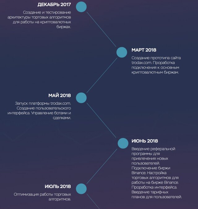 ТРОДАКС – АВТОМАТИЧЕСКАЯ ТОРГОВЛЯ КРИПТОВАЛЮТОЙ Добрый день! Приглашаем Вас в мир прибыльной автоматической криптоторговли - Trodax! Что такое Trodax.cat? Trodax создан профессиональными трейдерами для людей, которые хотят быть вовлеченными в мир криптовалюты и торговать только в плюс ☺! Идея о создании такого сервиса пришла нам, когда мы наблюдали за ситуацией на рынке: трейдеры-новички покупали криптовалюты и не знали, как торговать таким образом, чтобы получать доход, а не уходить в большие минуса, но, при этом, они не хотели глубоко погружаться в подробности устройства процессов криптовалютного трейдинга. Поэтому, мы создали сервис, который дает Вам возможность гарантированно торговать в плюс без вашего постоянного участия! Кликните на ссылку, чтобы получить пробную 14-дневную версию Trodax! https://trodax.com Trodax – это автоматический сервис для торговли криптовалютами, основанный на гибридном интеллекте. Просто подключите Trodax к вашей криптовалютной бирже, выберите криптовалютную пару и настройки, которые соответствуют вашим целям! Trodax будет формировать идеальные условия для создания и увеличения вашей прибыли! Как это возможно, - получать стабильный рост Вашего депозита автоматически? Базовый алгоритм работы сервиса очень прост. Получив сигнал для входа, Trodax приобретает монету и тут же выставляет ордер на её продажу и 3 страховочных ордера . Если цена растёт и заявка срабатывает, сделка завершается в плюс. Если нет — срабатывают страховочные ордера. Таким образом, в запасе постоянно имеется несколько страховочных ордеров, каждый из которых размещается на определённый процент ниже цены открытия сделки. Take Profit также сдвигается вслед за падением цены. Так отрабатывается стратегия усреднения. Тем самым для достижения желаемого Take Profit , не нужно ждать изначальной цены продажи. Вы получаете доступ на парень управления на нашем сайте, а также в мобильном приложении, и можете следить за всеми процессами торговли на вашем аккаунте, которые совершаются автоматически. Вам доступны все отчеты, аналитика, а также Вы можете получить рекомендации по выбору криптовалюты. Все сделано людьми для людей! Мы учли все пожелания, а также недоработки всех торговых ботов! Кликните на ссылку, чтобы узнать больше подробностей о Trodax: https://trodax.com/about/ У нас есть два режима работы алгоритма: ручной и автоматический. Ручной режим Просто подключите API ключи от биржи, выберите криптовалютную пару и установите настройки бота. Далее, Вы можете сами выбирать момент входа на рынок или предоставить этот выбор Trodax, используя необходимые фильтры. В среднем, трейдеры зарабатывают от 3% во время падения рынка, до 60% во время активного роста. Автоматический режим Просто подключите API ключи от биржи, выберите желаемые настройки соотношения прибыли-риска и Trodax будет торговать в плюс без Вашего участия! Торговый бот выбирает криптовалютную пару и момент входа на рынок, в соответствии с торговой стратегией, разработанной на основе гибридного интеллекта. Больше подробностей о нашем автоматическом и ручном режимах работы: https://trodax.com/faq/ Секрет успеха Тродакс: • Профессиональный опыт в торговле криптовалютами Мы собираем прогнозы, сделанные лучшими трейдерами и используем их в нашем сервисе. • Гибридный интеллект Собрав лучшие и достойные доверия прогнозы трейдеров, искусственный 
