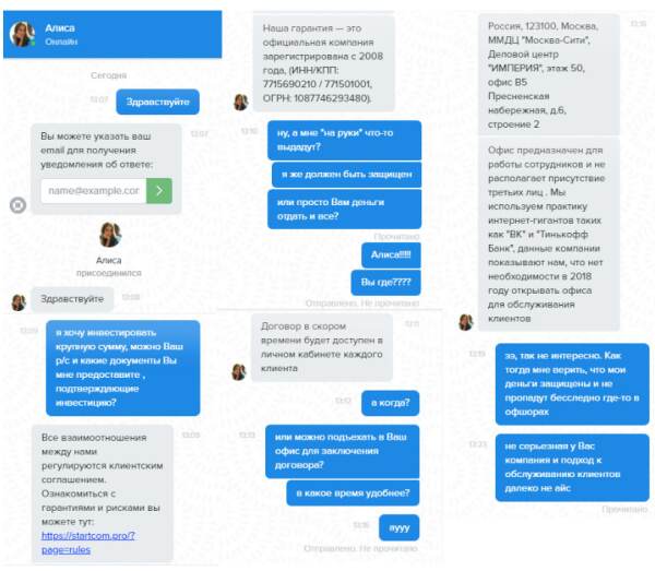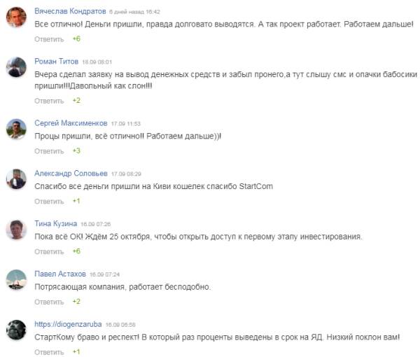 Стартком - новый качественный крипто лохотрон, уровня Ванкоин или Криптоголда. Cайт: https://startcom.pro Проект имеет хорошо раскрученную группу Вконтакте. Странно, что администрация Вконтакте их не банит, возможно, Стартком еще не успел покидать людей или это не лохотрон вовсе, давайте разбираться, стоит ли вкладываться в этот проект. Стартком рекламирует себя как инвестиционный фонд. Обещает доходность вложений 1.5% в день, это почти 50% в месяц. Не каждый хайп имеет наглость обещать такой процент. На сайте есть калькулятор доходности. При вложениях 6500 р. (эквивалент 100$) через 28 дней компания обещает вернуть почти 10093 р. Причем 10093 это не заработок, заработок это 10093-6500=3593 р. Психологический прием. Правда на сайте предупреждают, что вы можете и "проиграть". Просто с "командой профессионалов" Стартком у вас шансов проиграть, якобы, меньше. Как и у всякого лохотрона у проекта имеется реферальная программа. Из текста видно, что проект нацелен на неопытных пользователей - избегают слов реф. ссылка, реферальный и т.п. Хайпу, обещающему высокий процент, нужна агрессивная реклама в сегменте с наименее критично настроенной публикой. Поэтому рекламируется Стартком преимущественно в Ютубе через блогеров. Разумеется, отзывы "благодарных клиентов" на сайте тоже имеются. Разумеется, никаких гарантий и даже своего расчетного счета у компании нет. На вопросы о гарантиях в чате следует игнор.