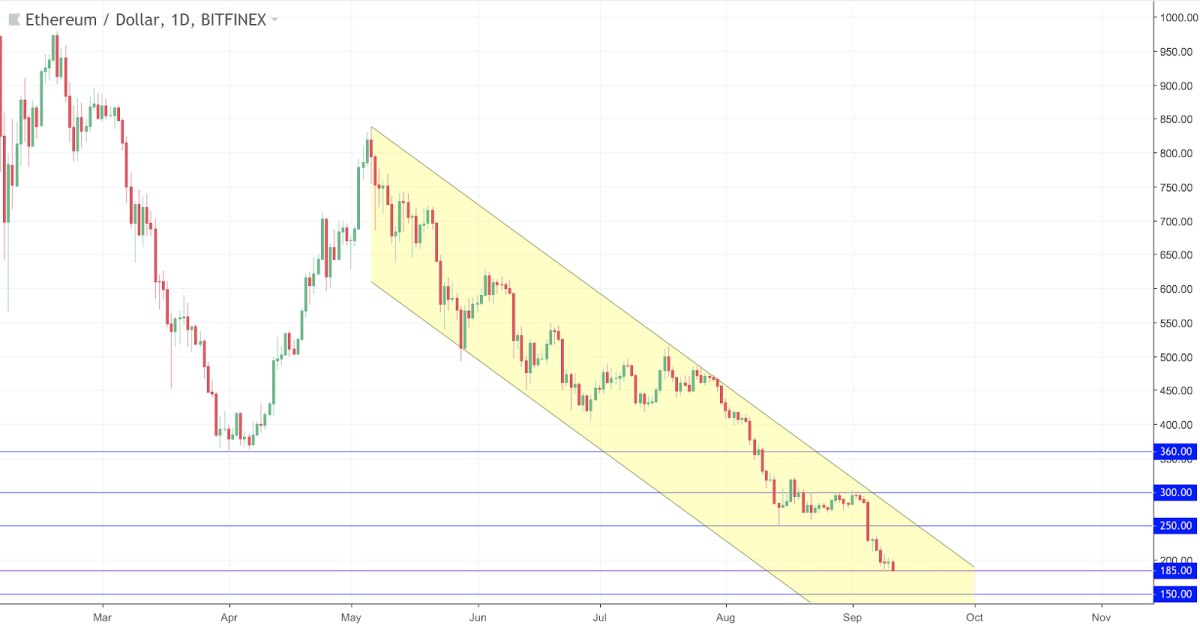 Рис. Технический график ETH/USDT на криптобирже Bitfinex (Daily). Текущее положение токена №2 – плачевное. В данный момент мы наблюдаем нисходящую тенденцию, уровень поддержки которой находится в районе психологической отметки $300. При этом видим сопротивление между двух горизонтальных уровней – $185 и $150. Причинами такого развития событий выступают следующие фундаментальные факторы: *во-первых, это общерыночная тенденция, где происходит снижение цены всех токенов, включая биткойн; *во-вторых, это снижение вознаграждение майнеров с 3 ETH до 2 ЕТН за блок, что негативно повлияло на мощности сети. Если в августе этот показатель составлял 300 трлн хешей в секунду, то сейчас он упал до 270, что является новым историческим минимумом и рекордом в динамике снижения; *в-третьих, это отсутствие презентации стандарта ERC777, который позиционируется в качестве более гибкой альтернативы ERC20. Помимо всего прочего неясной остается позиция со стороны Виталика Бутерина. В общении с представителями издательства Bloomberg он подчеркнул, что популярность криптовалют и технологии blockchain уже достигла своего наивысшего уровня в декабре 2017 года, когда цены на основные активы выросли в сотни раз. Он предполагает, что сценарий такого развития событий больше не повторится, а это снижает вероятность возврата курса Etehreum к историческому максимуму – $1420. Создается впечатление, словно участники криптосообщества потеряли веру в одного из наиболее влиятельных людей целой индустрии, что подстегнуло курс ЕТН уйти резко вниз по отношению не только к фиатным валютам, но и к самому Bitcoin. При этом, анализируя объемы биржи Bitfinex, было установлено, что число коротких позиций по паре ETH/USD достигло своих исторических максимумов – 211 000 контрактов. Интересно то, что буквально за 3 недели, число медведей на рынке эфириума выросло на 160%! Исходя из вышесказанного, дела у Ethereum плохи. И даже недавний слух о том, что к концу 2018 года Чикагская опционная биржа СВОЕ запустит фьючерсные контракты на эфир, не поменяли общерыночную тенденцию, которая на данный момент остается под полным контролем медведей. Автор: Дмитрий Лебедь, трейдер закрытого криптофонда X-Capital, спикер школы криптотрейдинга Simple Trade
