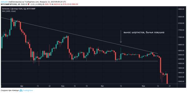 Источник: https://ru.tradingview.com/u/elchanin/ После импульса 8 февраля рынок утих в флете, что говорит о низком интересе покупателей. Исходя из этого, можно представить данный росток как открытие биг-шорта, ибо всплеск объема на CME просто космический! После таких предположений мозг сменил бычью прошивку на красного медведя. Что будет с Битком, если главный манипулятор медведь? Эта мысль заставила меня найти доводы за снижение. Сейчас я расскажу и покажу их, поехали! 20 часов назад Комментарий: 1. Фрактал треугольника Падения с $6100 Один треугольник уже был, ничего не мешает отыграть второму! Похоже на рост 8 февраля, правда? 20 часов назад Комментарий: 2. Сравнительный анализ фрактала 2014 года Сегодняшняя ситуация Битка уж больно похожа на 2014 год, по закономерности которого большинством ожидается откат до 50-62% коррекции падения с $6100. Однако, анализируя историю можно упустить тот факт, что в 14г паттерн пГИП отработал четко по статистическим целям коррекции! Наш же пГИП оказался бычьей ловушкой. Включаем абстрактное мышление, и стираем результат отработки пГИП 14, получаем аналогичный треугольник нашему. Похож же 20 часов назад Комментарий: 3. Медвежья дивергенция Стохастика на недельном ТФ + выявленная зависимость скользящих поддержек На недельном ТФ все выглядит гармоничнее, и если в 14 году MA108 отодвинула падение к дну, то сейчас в этом же месте MA204 выполнила данную функцию. Зависимость следующая: увеличение в два раза первого числа, уменьшение третьего тоже в два раза. 19 часов назад Комментарий: Почему маркетмейкер медведь? Гипотеза гласит о том, что Бычий забег 17 года был организован непосредственно под открытие официальных фьючерсных торгов. После чего произошел перелом тренда. Теперь медведи-организаторы настроены на снижение до минимального значения. Все просто – владельцы печатного станка хотят урвать максимум. Но, снижать нужно до адекватных значений, ведь ММ на рынке не один. Исходя из этого, самую адскую цель можно найти на уровне хая забега 14 года (около $1150). Не стоит забывать, что интерес к Биткоину есть и у долгосрочных инвесторов, которые наблюдают из далека. Поэтому, прогнозирую разворот тренда у скользящей MA402 – средняя цена за всю историю торгов Битштампа (ведущая биржа на мой взгляд).