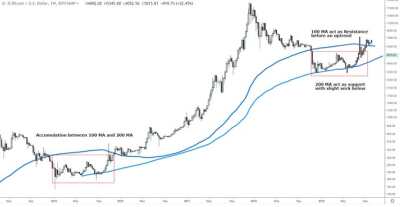 Трейдер и криптоаналитик Джош Рейджер предположил, что фаза накопления биткоина продлится до середины июля, затем последует уверенный рост цены. По его словам, текущая динамика цены схожа с той, что наблюдалась в 2015 году. После достижения биткоином «дна» фаза накопления продлилась 216 дней: Сравнение динамики движения цены биткоина в 2015 и в 2019 году. При этом сформированная 2 апреля бычья свеча величиной в $1000 соответствует середине текущей фазы накопления. Последняя, уверен Рейджер, завершится 19 июля 2019 года. Однако трейдер подчеркнул, что это лишь гипотеза. Позже он опубликовал твит с графиком, где указано, что границами зоны консолидации могут служить простые скользящие средние (МА) с периодами 100 и 200 недель, выступающие в роли сопротивления и поддержки соответственно. Таким образом, для начала бычьего ралли цене необходимо пробить сопротивление в виде 100-недельной MA. Неделю назад Джош Рейджер поделился мнением, что грядущая фаза бычьего цикла биткоина завершится в 2023 году на отметке $150000.