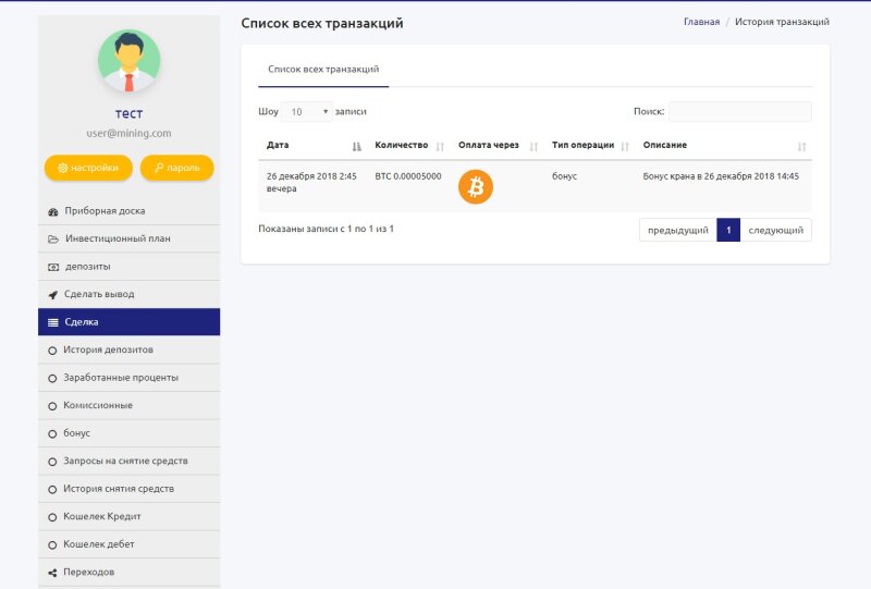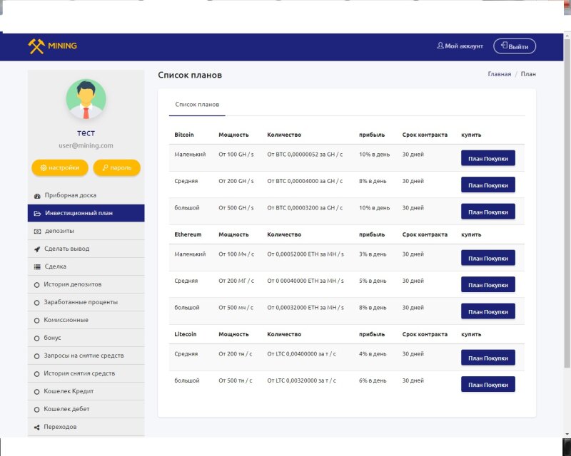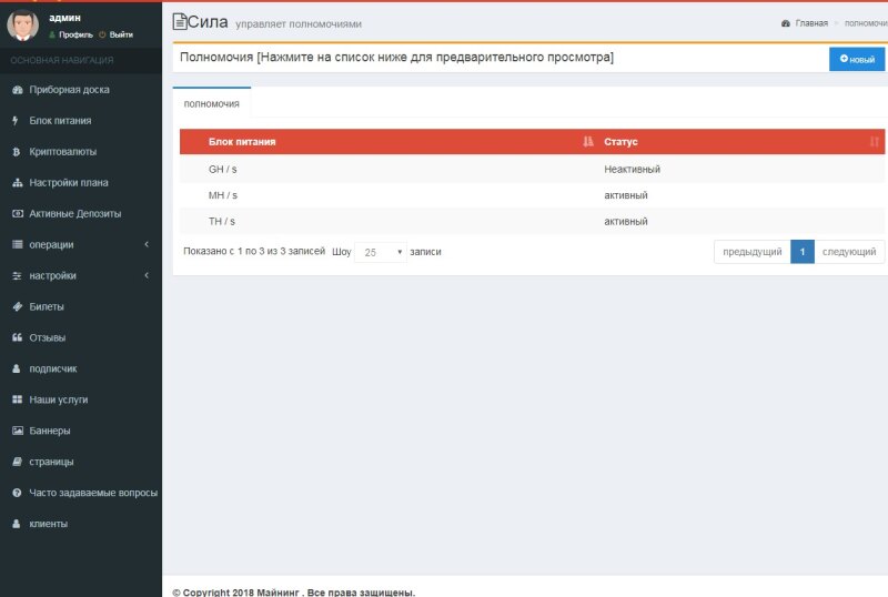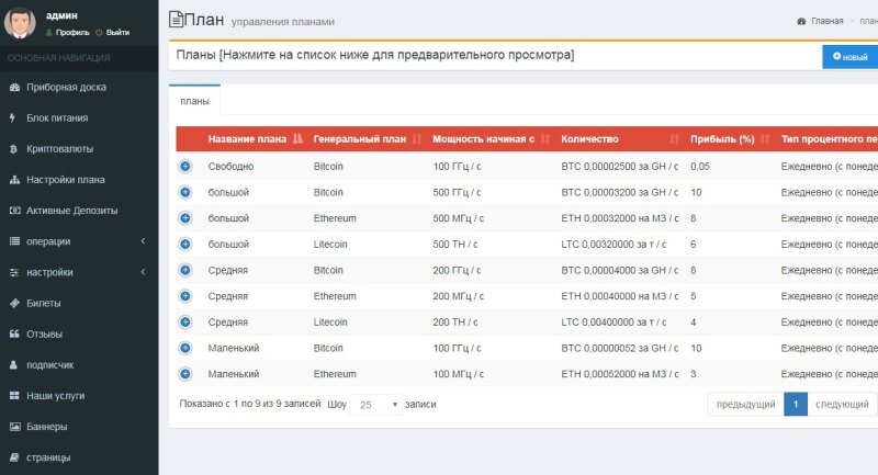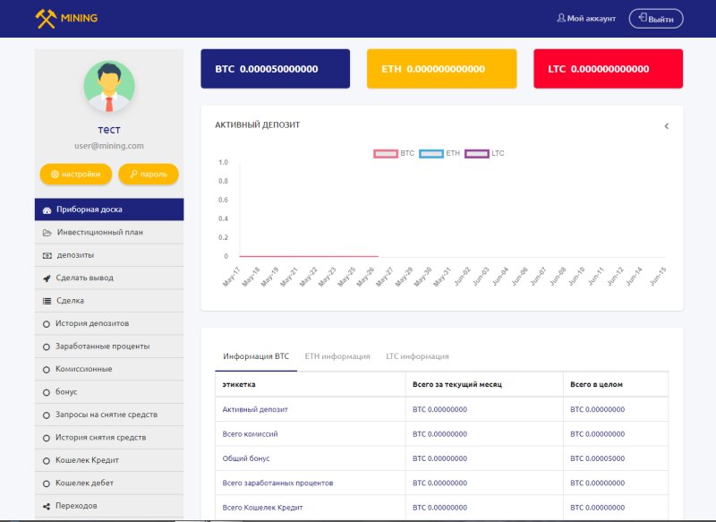 Скрипт облачного майнинга! Здравствуйте,предлогаем вашему вниманию скрипт облачного майнинга.Мы команда которая занимаемся разработкой различных проектов на криптовалюте.Продаем готовые проекты ,а так же занимаемся разработкой под заказ. Что есть в данном скрипте: 1) Очень удобная "Админ панель". Функции админ панели: - Приборная доска - Блок питания - Криптовалюты - Настройки плана - Активные Депозиты - операции: Все транзакции депозиты История вывода Запросы на снятие средств Всего комиссий Пользователь Кошелек Кредит Пользователь кошелек дебет Интерес бонус Запросы на утверждение - настройки: Настройки компании Шаблоны электронной почты Способ оплаты Настройки оплаты филиал выплата - Билеты - Отзывы - подписчик - Наши услуги - Баннеры - страницы - Часто задаваемые вопросы - клиенты Настройки компании Шаблоны электронной почты Способ оплаты Настройки оплаты филиал выплата Скрины некоторых функций предоставлю под описанием.(Все чем можно было упростить Администрирование проекта все есть!). 2.Панель самого пользователя и функции: Приборная доска -Инвестиционный план -депозиты -Сделать вывод -Сделка -История депозитов -Заработанные проценты -Комиссионные -бонус -Запросы на снятие средств -История вывода -Кошелек Кредит -Кошелек дебет -Переходов -Баннеры -Билеты Так же настройки пользователя туда входят: настройки кошельков криптовалют на которые пользователь хочет выводить средства,так же есть Два FA. Так же доход отображаеться графиками. На самом сайте стоит хороший дизайн под все мобильные версии. Так же есть возможность установить мобильное приложение ios и android естественно немного нужно доплатить. Стоимость данного скрипта всего 150$ без доработок,стоимость доработок зависит от того ,что вы хотите добавить и изменить. Так же при покупке скрипта за 180$ адаптивный дизайн под вас!!! На запрос отвечаем быстро в течении 10 минут. Пишем на почту: cryptoskript22@gmail.com Есть возможность получить скрипт бесплатно,для этого нужно привести 2 покупателя.