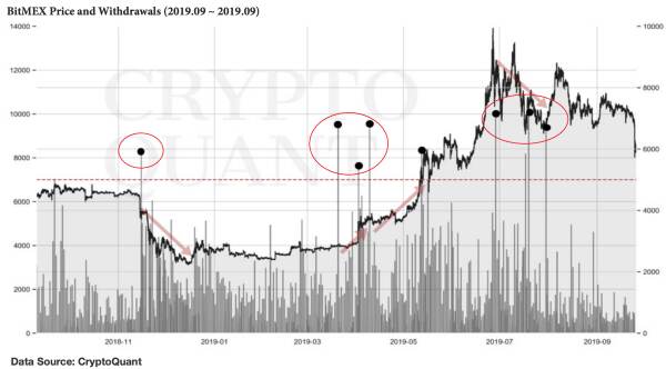 По данным аналитиков фирмы CryptoQuant, только за прошедшие пару дней на бирже BitMEX было ликвидировано огромное количество длинных позиций общей стоимостью больше 700 миллионов долларов. То есть с каждым проседанием курса происходила распродажа партии монет, что ещё сильнее роняло курс. Это событие является отчасти как следствием, так и причиной падения Биткоина. По крайней мере, в этом уверены некоторые эксперты. Отметим, что BitMEX является крупнейшей площадкой для маржинальной торговли биткоинами. Неудачные сделки с плечом часто ликвидируются, если цена торгового актива идёт в противоположном от ожиданий трейдера направлении. Ликвидация совершается автоматически при достижении активом определённого ценового уровня. Этот механизм позволяет бирже не терять позаимствованные трейдеру деньги. 24 сентября трейдеры вывели более 49 тысяч BTC, что спустя несколько часов серьёзно отразилось на цене главной криптовалюты. На графике ниже отмечены дни, когда с BitMEX выводили больше всего биткоинов. Как видим, после каждого такого дня цена монеты совершала резкие рывки. Источник: CryptoQuant