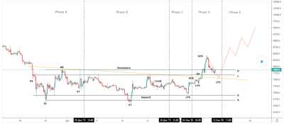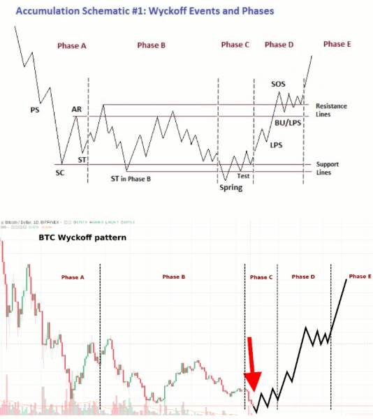 Модель Ричарда Вайкоффа позволяет спрогнозировать дальнейшее движение при наступлении дисбаланса между спросом и предложением и дальнейшей расторговке рынка вниз (слив), или выходом вверх (набор позиций). Рассмотрим случай наторговки объема. модель Вайкоффа Далее по пунктам: 1 — PS (Preliminary Support) — Появляются покупки, рост объема говорит о возможном «нащупывании» дна 2 — SC (Selling Climax) — Продавцы на издыхании, продажи толпы съедаются покупками больших игроков 3 — AR (Automatic Rally) — Почти никакого давления продавцов, волна позволяет определить один из верхних уровней торгового диапазона 4,7 — SC (Secondary Test(s)) — Большие игроки ретестят на вероятность дальнейших продаж, если дно подтвердилось, больших предложений больше быть не должно. 6 — Creek — Волновое сопротивление, пробитие которого будет сигналить нам о готовности рынка выйти вверх 8 — Springs or Shakeouts — Последний тест на предложение, пробитие поддержки считается нормальным при низких объемах и означает что нам открыли двери сверху. Большие объем — опасно. Средние — ждать еще тестов. 10 — JAC (Jump across the Creek) — Долгожданный волнообразного сопротивления 11, 13 — SOS (Sign of Strength) — Появление признаков силы, при пробое на хорошем спреде и объеме 12, 14 — LPS (Back up to Last Point of Support) — Откат к поддержке, бывшим уровням сопротивления. Идеальная зона для входа в лонг или прибавке к позиции. Вот как это может работать применительно к крипте.