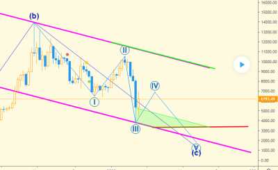 Уровень обозначенный на графике, главный кандидат на хороший шорт. Цена прошла его мимо, а сейчас забирает для ликвидности. Дневной ПП в лонг у Нас на 8000$ и пока этот уровень не пробьём, тренд не сменится. Перед глобальной сменой тренда всегда идёт накопление минимум месяц с волатильностью 500-1000$, т.к. купить крупные объемы за два дня нельзя. На рынке энтузиазм ещё не пропал и все надеются на скорый возврат к прежним уровням. Итог: Для того, что бы рынку дальше падать вниз, нужна ликвидность. Один из факторов ликвидности, это стопы лонгов, которые служат топливом для падения. Это неотъемлемая часть рынка, чем больше объёма в рынке и стопов, тем больше в итоге падение и соответственно прибыль маркетмейкеру. Ему не выгодно что бы объем сидел на заборе и наблюдал вне рынка, вот и загоняют всех для ликвидности. Ещё немного осталось и пойдём Мы на стопах и ликвидациях в нужное нам место. Ждем возможный откат к уровню 7200$, от которого будем брать шорт. Первая цель у Нас будет 5300$. Глобально тренд остается нисходящим и поход к 3900$ еще в силе.