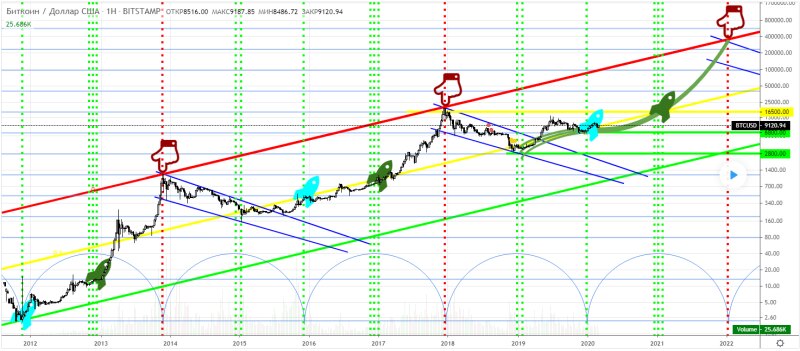 Подборочка бычьих прогнозов с трейдингвью. Рост до 60 к. $ Уже выкладывал здесь. Рост до 280 к. Похожий прогноз, с объяснениями. Прогноз до 900к$. 250 к$ Более реалистичный прогноз, до 11 к. С основной идеей, что 8300- это новое дно после халвинга. 20 к $ в ближайшие месяцы. Прогнозы до 350 к$