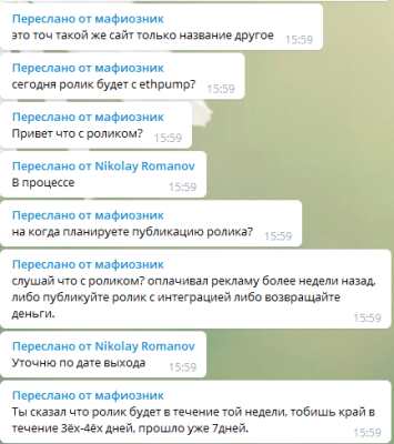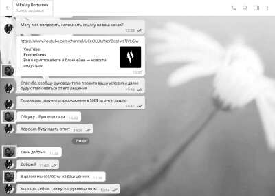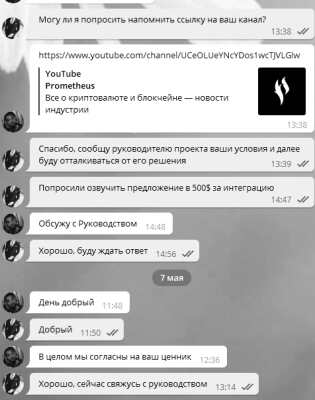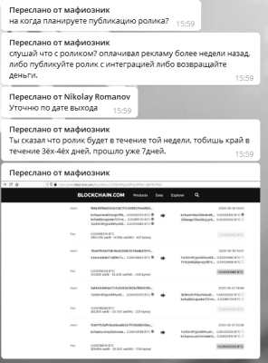 Разоблачение канала о блокчейне Prometheus Сначала ловит, а потом кидает: очередная выходка кидалы Руслана Соколовского Когда какой-то блогер на ютубе набирает популярность, он автоматически зарабатывает высокую репутацию и доверие со стороны рекламодателей. Блогерам просто невыгодно заниматься мошенничеством, поскольку в долгосрочной перспективе это сработает против них самих же – Интернет помнит все. К сожалению, не всегда популярность гарантирует соблюдение сделки, и поэтому рекламодатели несут определенные риски, поскольку вносят предоплату за интеграцию рекламы в YouTube-ролике. Речь идет об известном канале Prometheus, посвященному тематике блокчейна и криптовалют. Недавно с этим каналом произошел неприятный эпизод, когда рекламодатель заказал размещение своего рекламного ролика на канале Prometheus, а автор этого канал забрал деньги, так и не разместив интеграцию. Сначала рекламный менеджер канала Николай Романов долго “водил за нос” рекламодателя, убеждая его, что ролик вот-вот выйдет на канале, а затем вовсе перестал выходить на связь. Расскажем об этом случае мошенничества с каналом Prometheus подробнее. 4 мая представитель проект Ethpump связался с менеджером канала Prometheus Николаем Романовым через его официальный Telegram-аккаунт (@romanovastro), указанный в описании канала Prometheus в телеграме. Они договорились о размещении рекламного ролика на YouTube-канале и оговорили сумму для публикации – $500. Николай Романов заверил представителя Ethpump, что ролик выйдет в течение недели. После того, как размещение утвердили, представитель перевел оговоренную сумму на биткоин-адрес, предоставленный менеджером. Транзакцию вы можете посмотреть на скриншоте, приведенном ниже. Транзакцию можно проверить самостоятельно в блокчейн-обозревателе, указав Tx ID или хеш транзакции, чтобы убедиться в достоверности. После оплаты рекламодатель уточнил, когда выйдет следующий видеоролик с интеграцией, но сообщение осталось без ответа. Близился конец недели, и заказчик хотел уточнить сроки выхода ролика. Далее последовало просто возмутительное поведение! Николай Романов ответил только с третьего раза и уверял, что ролик находится в монтаже. Затем при следующих обращениях получал приблизительно такие же по сути ответы: что подготовка видеоролика находится в процессе, и он уточнит дату его выхода на канале Prometheus. Прошло более недели, но автор так и не выложил ролик с интеграцией после того, как менеджер забрал деньги. Хотя менеджер и продолжает выходить на связь, но все ограничивается банальными отмазками – он продолжает нагло кормить рекламодателя “завтраками”. Так оказалось, что менеджер этого известного канала Николай Романов – мошенник. Вот так легко без зазрений совести можно кинуть любого человека, и на месте представителя может оказаться кто-угодно. Достоверно неизвестно, кто является менеджером – реальный посторонний человек или сам автор канала Руслан Соколовский. Вот такой сюжетный твист: автор канала может прикинуться, что он не имеет к этому отношения, но нельзя установить, что Николай Романов – реальное лицо, которому принадлежит аккаунт. А это позволяет неплохо выкрутиться из ситуации. Хотя сухим из воды все равно не вылезти, т.к. сам автор непосредственно несет ответственность за тех, с кем он работает. С Русланом Соколовским ранее уже случился скан