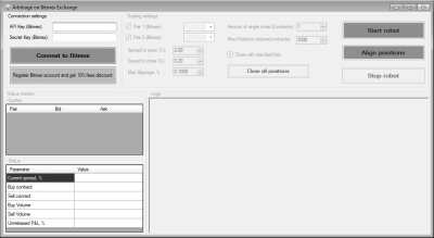 Данная стратегия работает на паре инструментов на один и тот же актив, но с разными датами экспирации (Например: бессрочный контакт на Биткоин - XBTUSDи контракт с датой экспирации 25 сентября - XBTU20), робот ждет, когда цены на актив разойдутся и покупает актив, который дешевле и продает тот, который дороже. Когда разница цен между фьючерсами уменьшается, робот фиксирует прибыль. Например, во время сильных движений 06.02.2020 на бирже Bitmex, в какой-то момент времени бессрочный контракт XBTUSD торговался по цене около 8600$, а XBTM20(фьючерсный контракт на Bitcoin истекающий 26 июня) по цене 9260$, то есть разница между этими контрактами была около 7,7%, а 06.04.2020 разница между данными контрактами уже была равна нулю. Соответственно чистая разница составила 7,7%, что при кредитном плече x100 примерно равняется 390% прибыли. Робот предоставляется бесплатно, при условии регистрации по партнерской ссылке (по ссылке можно перейти из интерфейса робота). Регистрация по ссылке дает скидку 10% на все комиссии биржи в течение 6 месяцев. После запуска робота, при попытке установить подключение с биржей автоматически произойдет проверка регистрации и если вы зарегистрировались по партнерской ссылке, то связь с биржей Bitmex будет установлена, если нет, то робот работать не будет. Ссылки на видео: Как создать APIключи на бирже Bitmex – Запуск робота – Пример набора позиции – Пример закрытия позиции – Рекомендации по роботу: Доходность робота напрямую зависит от пользовательских настроек, задержек до биржи(пинга), волатильности рынка и уровня риска. При минимальном риске слив депозита практически не возможен. Подбор параметров торговли (разница между активами для открытия и закрытия позиций) осуществляется пользователями самостоятельно. Рекомендую набирать позицию плавно, т.е. делить максимальный объем позиции минимум на 100 частей, а также придерживаться разумного мани-менеджмента и ступенчатого набора позиций. Позицию лучше набирать «лесенкой», например сначала набираете позицию на 2% разницы, затем на 3%, затем на 5% и так далее. Цена входа в сделку практически не важна, т.к. прибыль получается от разницы цен между двумя инструментами. Не рекомендую запускать 2 и более роботов на одном аккаунте (даже с разными Apiключами), для избегания бана по IPсо стороны биржи. Либо, если будете работать на VPS, то покупать 3-4 IPадреса сервера и менять IPкаждые 15-20 минут (смену IPможно автоматизировать). !!!Для работы робота обязательно установите в настройках биржи уровень маржи – CrossMargin!!! Настройки робота: ConnecttoBitmex - при нажатии на кнопку устанавливает связь с биржей (без торговли) APIKey – Apiключ из личного кабинета биржи; SecretKey - Apisecretключ из личного кабинета биржи; Pair 1 – Первый фьючерсный контракт Pair 2 - Второй фьючерсный контракт Spreadtoopen (%) – Минимальная разница цен между контрактами (Pair 1 и Pair 2) в % для открытия новых позиций Spreadtoclose (%) - Минимальная разница цен между контрактами (Pair 1 и Pair 2) в % для закрытия открытых позиций MaxSlippage (%) – максимальное проскальзывание(если 0, то ордера будут лимитными по лучшей цене, если больше ноля, то исполнение будет по маркету, но не больше заданного отклонения) Amountofsingleorder(Contracts) – Размер единичного ордера для набора позиции MaxPositionsvolume(Contracts) – максимальный размер позиции для каждого контракта Closewithstandardlots – если установлена галочка, то закрывать позиции робот будет размером из Amoun
