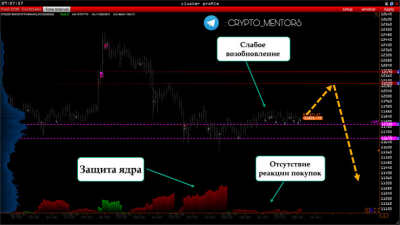 О текущей ситуации на рынке рассказывает практикующий трейдер и основатель проекта Crypto Mentors Никита Семов. Цена биткоина вышла из локальной перекупленности, сформировав паттерн UT, что говорит в пользу снижения (после захвата ликвидности на стоп-ордерах по коротким позициям). Глобально видим очень красивую картинку с рисующимся перепозиционированием, которое приведет к снижению котировок до $11 000. Для завершения модели необходимо удержать $11 900, где находится предыдущий объемный массив, который мы уже можем классифицировать как продажный. Среднесрочно упали на ядро всего августа. При падении начали появляться элементы защиты, что выражено в повышенной продажной дельте, а также вспышками ликвидности. Дальнейшей реакции не последовало — покупатели восстанавливаются слабо, а контроль опять закрепляется за продавцами. Локально на отскоке розничные трейдеры начали активно открывать лонги, однако в минувшем боковике позиции были закрыты, что говорит о крайней неуверенности покупателей. Также можно выделить локальную защиту, которая имеет все шансы толкнуть котировки выше, тем самым сохранив баланс.