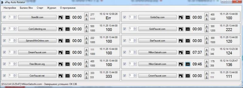Доброго времени суток, уважаемые! Предлагаю для тестов программу ePayAutoRotator. Как уже понятно из названия, программа предназначена для автоматического прохода Bitcoin кранов с выводом на сервис ePay.info . Программа использует движок браузера Mozilla Firefox, поэтому наличие этого браузера обязательное. Для решения капчи используется сервис 9kw.eu. Кроме того можно использовать FineReader или ввод капчи вручную - в всплывающем окошке. В настоящее время реализована работа с 12-ю кранами, но в дальнейшем планируется увеличение количества кранов до 20. Напоминаю - программа выложена для тестов, ошибки, скорей всего, есть, но с вашей помощью надеюсь их исправить. Пожеления и конструктивная критика принимается, на хамство не реагирую. Всем удачи! С ув. SMoleTT Скрытое содержимое: **Скрытое содержимое: Для просмотра Вам необходимо минимум 1 сообщений на форуме.**