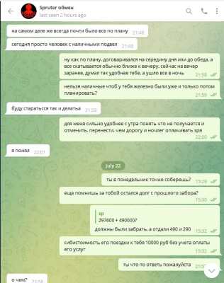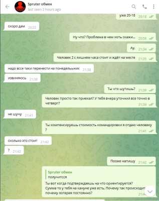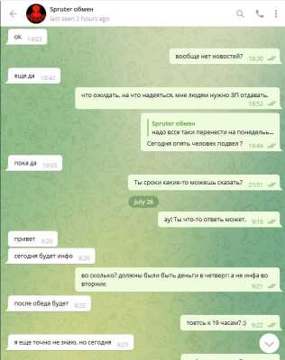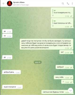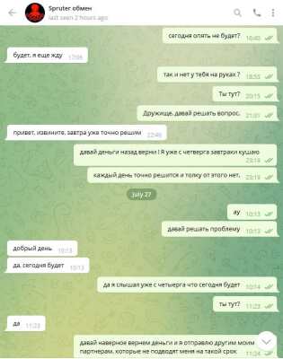 Будьте осторожны! Сервис обмена от Spruter кинул на крупную сумму денег. Его контакты: Jabber/XMPP: acrobat@spruter.com ICQ: 2233679 Telegramspruter Более года работали с@spruter по обмену и выводу средств с криптовалют. С 20 июля 2022 года "кормит завтраками" в ТГ. По просьбе выйти в жаббер отвечает "нет возможности". Суммы/реквизиты/личные данные затерты на скриншотах. Готовы предоставить более полную информацию модераторам, если потребуется. Скриншоты переписки с постоянными обещаниями, отговорками и "завтраками" прилагаю.