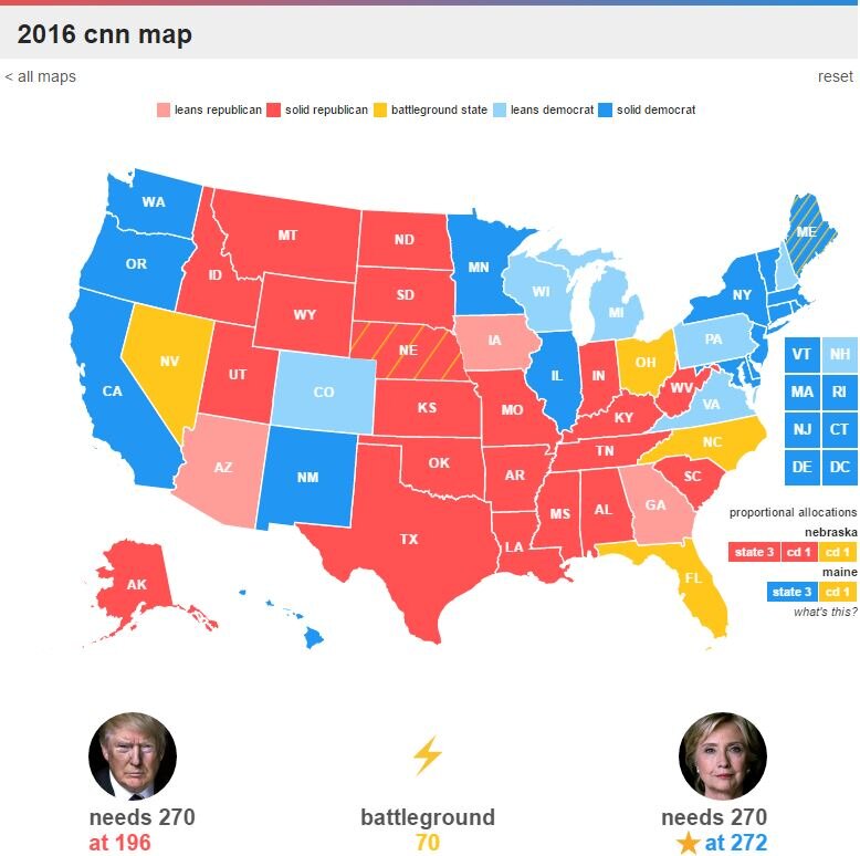 На данный момент на сайте cnn.com висит вот такая карта из которой следует что Клинтон набирает 272 голоса выборщиков необходимых для победы. Но если посмотреть на карту то в 7 штатах её преимущество невелико(у Трампа только в 3). Но учитывая последние опросы в неопределившихся штатах то Трамп набирает 262 выборщика,а Клинтон 272,также 2 неопределившихся. Вообщем нас ждут драматичные выборы