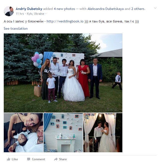 Представитель Bitcoin Foundation Ukraine Андрей Дубецкий 18 июля опубликовал на своей странице в Facebook информацию о первой украинской свадебной регистрации, записанной в блокчейн биткоина. Документы о заключении брака между биткоин-энтузиастом Олесем Слободенюком и Риной Духновской были записаны в блокчейн с помощью сервиса Weddingbook. Создатели сайта использовали возможности Cryptograffiti – веб-сервиса, который позволяет людям кодировать скрытые сообщения в блокчейн биткоина, используя специальный онлайн-интерфейс. В июне на сервис был добавлен новый функционал (запись JPG-картинок в блокчейн), которым и воспользовались в Weddingbook. Для осуществления с помощью этого сервиса записи свадебной регистрации в блокчейн требуется всего несколько кликов. Стоимость услуги в биткоинах рассчитывается сразу же над полем ввода информации. Как сообщается на сайте сервиса, раздел регистрации позволит не только навсегда оставить свадебное свидетельство в блокчейне, но и сохранить «список свидетелей, пожелания молодоженов друг другу и все, что пожелаете». Также отмечается, что запись о регистрации появляется онлайн уже через 10 минут.