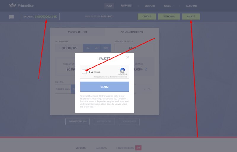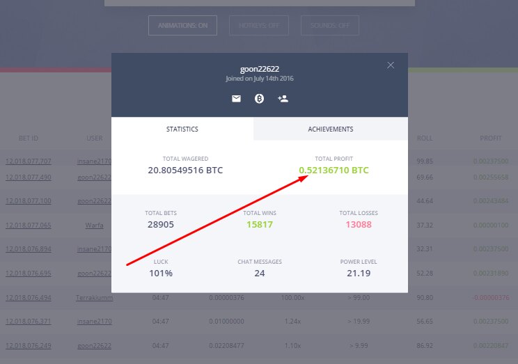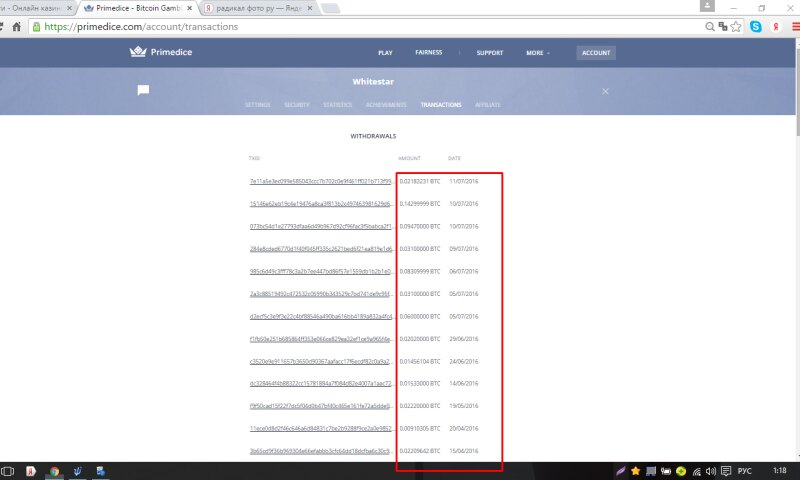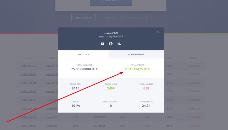 Приглашаем в первую и самую популярную игру на Bitcoin "КОСТИ" (Больше/Меньше) PRIMEDICE Отличное местечько , скоротать скучные вечера , или расслабится , в середине рабочего процесса ... --------------------- -------------- ------- ---- --- - -Казино работает c 2013 года -Более 20 миллиардов ставок -Средний вывод с проекта игроками 1400 BTC за 24 часа -Русский и Английский чат -Мгновенный вывод и пополнение счета -Контроль честности -Система достижений и Зал Славы -Функция авто-ставок И много другое .... Регистрация (партнерская ссылка): https://primedice.com/?c=Whitestar ------------------------------------------------------------ Немного статистики ребят с сайта Регистрация (партнерская ссылка): https://primedice.com/?c=Whitestar - Как получить бесплатные стартовые сатоши ?! - Стартовые сатоши можно получать не ограниченное количество раз , при условии , нулевого баланса. Делается это , очень просто: 1. В верхнем левом углу , нажимаем зеленую кнопку "FAUСET"2. Вводим капчу 3. На баланс упало 0.00000200 BTC (но для хорошей и стабильной игры , я бы советовал закинуть немного сатошей на счет) -------------------------------------------------- Несколько стратегий , для игры в казино: 1) Переходим в меню Авто-Ставки 2) Коффециент на победу выставляем 11.0х (шанс выиграть 9%) при победе наша ставка умножится в 11 раз 3) Умножение нашей ставки при проигрыше ставим всего 11-12% 4) Сумму ставки смотрите по вашему балансу. Некоторые ребята выставляют и по 0.5 BTC и по 1.5 BTC , минимальная ставка по этой страте 0.00000005 Вот так , она примерно работает:Чем больше минусов у нас подряд , тем выше профит Скрин показан как пример (баланс я бы советовал иметь не менее 0.002 BTC) Регистрируемся друзья, делим своими достижениями в данной теме Мои выводы с казино Мои контакты для связи ниже Пишите в любое время , готов ответить на все вопросы Jabber: Primedice@jabber.ru VIPole: Primedice41 -
