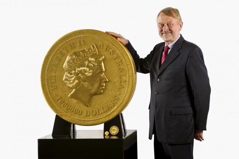 Рекорд Канады по изготовлению самой большой золотой монеты в мире недавно побила Австралия в 2015 году. Мастера монетного двора Австралии изготовили монету, которая весит чуть больше тонны. Диаметр ее составляет почти метр, толщина же равна 12 см. Кроме рекордного веса и размера, ценность этой монеты, в переводе на австралийскую валюту, приравнивается к одному миллиону. В переводе на международную расчетную единицу, американский доллар, ее стоимость составляет больше 50 миллионов. На аверсе этого чуда отчеканено изображение Елизаветы II, а на реверсе расположена фигура кенгуру. Процесс изготовления этой золотой монеты длился почти 2 года, причем делалась она без привлечения техники. Ее выпуск посвящен 60-ти летнему юбилею королевы Елизаветы II. В скором времени увидеть монету можно будет на выставке монетного двора Перта. Также, есть хорошая новость для нумизматов. Было принято решение выпустить ограниченное количество аналогичных монет меньшего размера.