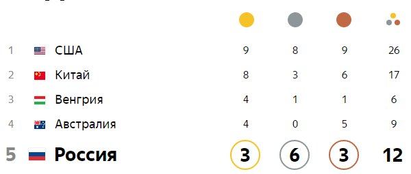 Немного припозднился с созданием темы, на данный момент результат такой. Сформировалась следующая пятерка лидеров. Уже очевидно, что выиграет, скорее всего, США, поэтому принимаю ставки против США 1/5. То есть, если США не выиграет олимпиаду, то ваша ставка умножается на 5. Максимальная ставка 500000 сатош или 5000 POST. Ставки на победу России принимаю 1/20. Максимальная ставка 300000 сатош или 3000 пост. Ставки на общее количество медалей сборной России принимаю 1/20. Можно делать ставки сразу на 10 вариантов. Максимальная ставка 300000 сатош или 3000 пост. Я не знаю какая тут вероятность, цифры с потолка. Ставки на место России в таблице принимаю 1/5. Уже видно, что скорее всего Россия будет в пятерке, поэтому коэффициент небольшой. Принимаю ставки на победу США, коэффициент 1.5, максимальная 300000 сатош или 2000 пост. Ставки на победителя олимпиады 1/2, максимальная 300000 сатош или 2000 пост. Минимальные ставки: 50000 сатош или 500 POST. Информация будет обновляться, возможно появятся еще варианты, предлагайте идеи. Приветствую создание ставок по Олимпиаде. Добавляю 200000 сатош всем, кто принимает ставки по Олимпиаде 2016, если не менее двух человек поставили в вашей теме и если минимальная сумма ставок от 50000 сатош или 500 POST.