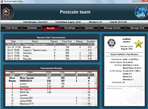 Сегодня в 19 00 по Мск ,состоится турнир. Призовой фонд составляет 1000 Postcoin. Призовые места распределятся следующим образом : 1-5 участников : 1 место 5-7 участников: 2 места ( 60-40% ) 7-12 участников : 3 места (50-30-20 %) 12-20 участников 5 мест (40-20-20-10-10 %) Условия : Необходимо выполнить одно из действий : 1.Вступить в группы "Вконтакте" и рассказать друзьям о клубе 2. Сделать ретвит данной записи : https://twitter.com/klarki1/status/793102727287074817 3.Отписать комментарий о нашем клубе в теме на : https://www.pokerstarter.online/forum/showthread.php?124787-Покерный-клуб-PostcoinTeam Без выполнения хотя бы одного из условий ,на призовые не претендуете.
