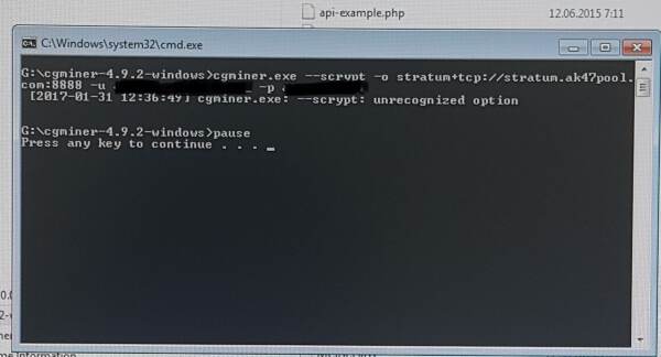 подскажите, как должен выглядеть батник для CGMINER? прописываю cgminer.exe --scrypt -o stratum+tcp://stratum.f2pool.com:8888 -u имя -p пароль но ничего не происходит, консоль открывается на полсекунды и сразу же пропадает