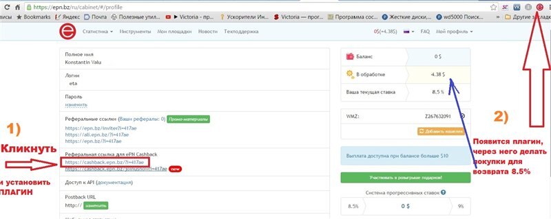 Что-то интерфейс слегка не такой как на картинке, не вижу вообще в кабинете ни "Реферальная ссылка для ePN Cashback ", ни кнопки "Плагин" никакой. Ну для установки плагина, к примеру, в пришедшем письме была ссылка, а что дает клик на "Реферальная ссылка для ePN Cashback " не совсем понял.