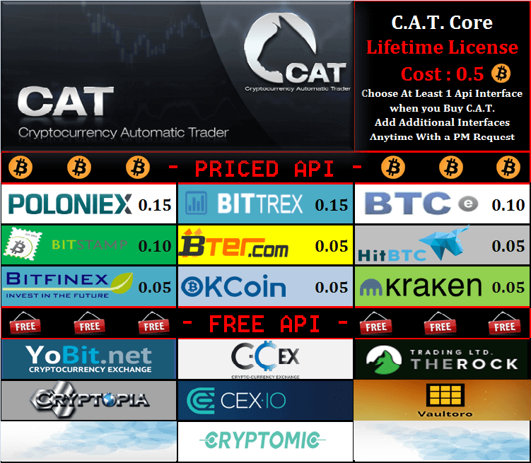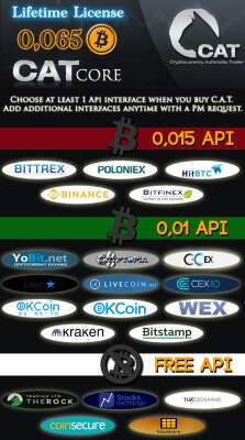 Текущая версия : 4.4 Первый Релиз : Сентябрь 22, 2013 Что такое C.A.T.? Прайс Для того ,чтобы получить скидку в размере 10% ,вам необходимо отправить сообщение продавцу в личку на bitcointalk https://bitcointalk.org/index.php?action=profile;u=130152 C текстом : "Hi, klarki (https://bitcointalk.org/index.php?action=profile;u=407174) is my ref and i want to buy a CAT copy with the 10% discount" Какие биржи поддерживает Бот? Btc-e , Poloniex,Bittrex, Bter, HitBTC, BitStamp, Bitfinex, Vaultoro,The Rock Trading, YoBit, C-CEX,CEX.IO,Cryptopia,OKCoin (com/cn),Kraken,Livecoin,RawX. Официальная тема : https://bitcointalk.org/index.php?topic=507103.0