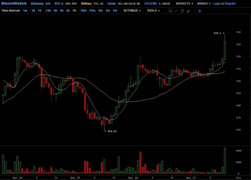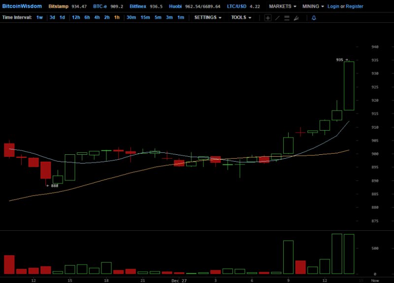 После небольшой передышки во вторник, 27 декабря, курс биткоина продолжил восхождение и по состоянию на 12:40 UTC (15:40 мск) обновил новый годовой максимум, добравшись до $935 на бирже Bitstamp. Примечательно, что последний раз на этих отметках криптовалюта торговалась 7 января 2014 года – день краха биржи Mt Gox. В тот памятный для всего биткоин-сообщества день курс резко обвалился, упав в течение одного дня с $919 до $785. Таким образом, только в декабре текущего года цена биткоина выросла более чем на 25%, а в годовом выражении эта цифра превышает уже 115%. Напомним, в первых числах января криптовалюта торговалась в районе $430. Психологическую высоту в $900 биткоин взял 23 декабря, однако в последующие несколько дней периодически опускался, коснувшись даже через два дня отметки в $858. Тем временем близка к покорению отметки в $15 млрд и рыночная капитализация первой криптовалюты: на момент публикации она оценивается в $14,965 млрд.
