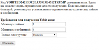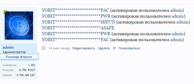 Что такое Yobit-код читайте здесь. На форуме давно существует тема, где пользователи раздают йобит-коды ненужных криптовалют. Я призывал тех, кто берет коды, ставить лайки, а тех, кто размещает коды, прятать их под хайд. Но пользователи как размещали коды без хайда так и размещают, стало быть их могут активировать даже анонимы, не зарегистрированные на форуме и не понятно, какой код активирован, а какой еще нет. Теперь скрипт автоматически распознает Yobit-код и приводит его к такому формату. YOBIT**********************PAC Самого кода не видно, даже если посмотреть исходный код html-страницы. При нажатии на код (рекомендую кликать по коду с нажатой клавишей CTRL, чтобы открыть его в отдельном окне) мы попадаем на отдельную страницу, где код можно скопировать. Теперь видно, какой код активирован и кем. Если мы видим ситуацию, что какой-то один пользователь активирует много кодов и сам не размещает коды, к нему могут применяться санкции. Каждому коду можно задавать требования для его активации. Для этого вам нужно сначала разместить код, а затем кликнуть по нему: откроется такое окно. Чтобы код не активировали раньше, чем вы зададите для него ограничения, при открытии окна настроек выставляется таймер 3 минуты, за это время никто не сможет активировать код. Например, вот как я вижу код, который размещен для пользователей у которых от 30 лайков, 30 сообщений и состоящий в группе Проверенные. Я состою в группе Администраторы, соответственно не могу активировать код для проверенных. Немного поясню технологию. Когда вы размещаете код, то становитесь его владельцем и ваш id прикрепляется к коду. Соответственно, при нажатии на код, у вас откроется не окно активации, как у других пользователей, а окно установки требований для получения кода. На установку требований вам дается 3 минуты - за это время никто другой не может активировать код. Если вы хотите разместить 10 кодов в одном сообщении и боитесь что 3 минут вам не хватит, чтобы установить требования для всех, то можете добавлять коды постепенно, редактируя собственное сообщение. Если для кода не задано специальных ограничений, то действуют стандартные ограничения. 1) Пользователь без лайков не может активировать код. 2) Если у пользователя менее 30 сообщений на форуме, то он может активировать только один код в сутки. 3) Нельзя активировать больше 3 кодов в сутки. 4) Нельзя активировать более 5 кодов в течении 5 дней. Стандартные ограничения могут быть изменены, они обсуждаются с пользователями. Вы можете разместить код, полученный от другого пользователя. Например, если вы смогли обойти ограничения для кода, но код вам не нужен - вы можете передать ему другим. Если код разместил пользователь, который его ранее взял, то он становится новым владельцем кода и может задавать ему требования активации.