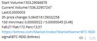 Итак, тестирую первый сигнал. Монета: RDD По цене сигнала войти не успел (об этом ниже). Кстати, рекомендовали всё же входить по сигналу: несколько пунктов при такой цене дают нелишний процент. По сути обычный крипто-коин, достаточный объём есть, все торги на Биттрексе: Так успел войти: Цели на продажу (в BTC, а не в USD) поставил следующие: 18%, 34%, 50%, в равных долях: Итого: Опробуем сигнал без дополнительной аналитики. Вообще без какой-либо аналитики. Результат буду смотреть на горизонте 5-7 дней.