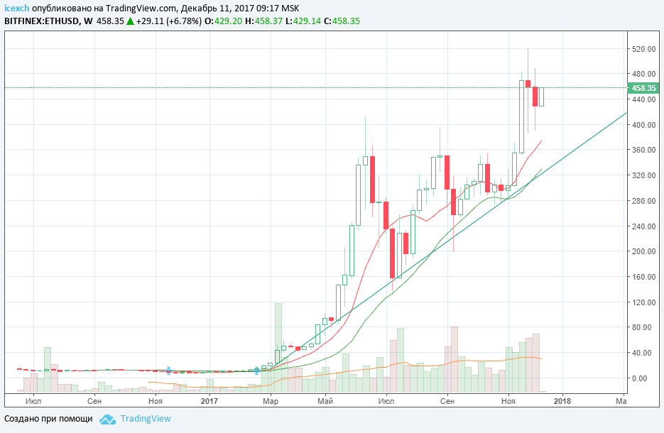Ethereum вырос вырос лишь на 50% за прошедшую осень (из точки затухания колебаний около $300). Тем не менее, его 45-кратное удорожание к доллару с начала года, оставляет Bitcoin в роли догоняющего. И позволяет прочно удерживать вторую позицию по капитализации с $44.7млрд. Дальнейший рост представляется более вероятным. При этом потенциал коррекции ограничен уровнем поддержки на $390-400. Первая графически просчитываемая цель роста на $650. Рекомендация: покупать около поддержки на $400. #icex #bitcoin #криптовалюты #инвестиции #биржа #анализ #Ethereum